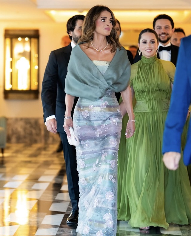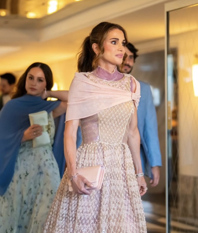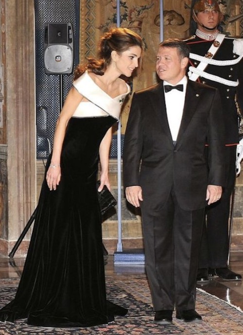 Queen Rania of Jordan has worn Armani for several years, including on several visits to Italy, most notably wearing two vintage Armani gowns for the Wedding of Jeff Bezos and Lauren Sanchez in Venice earlier this year.