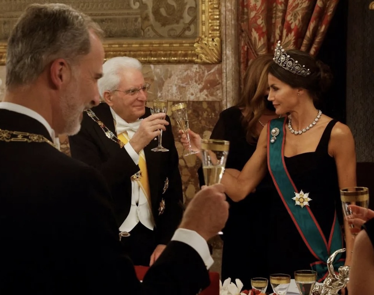 Queen Letizia of Spain wore an Armani suit to announce her engagement to the Prince of Asturias in 2003, and also on a State Visit to Japan, most notably wearing an Armani gown for the Italian State Visit to Spain in 2021.
