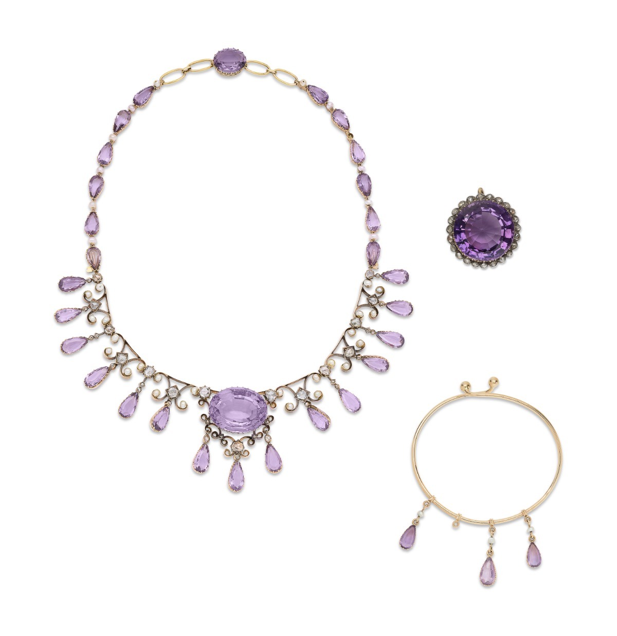 An Amethyst and Diamond Necklace, Bracelet and Brooch with round, pear and oval-shaped amethysts, seed pearls, rose-cut diamonds, one portion of the neckchain is detachable and may be worn as a shorter necklace and one bracelet, brooch may be worn as a pendant, circa 1880.