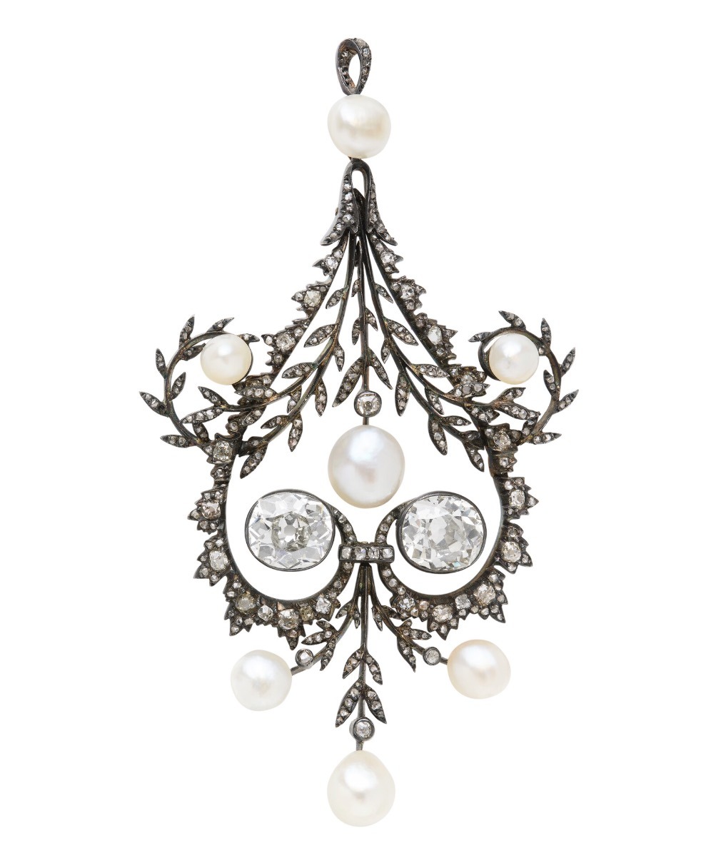 A Pearl and Diamond Pendant with button-shaped natural pearls, old and rose-cut diamonds, circa 1850.