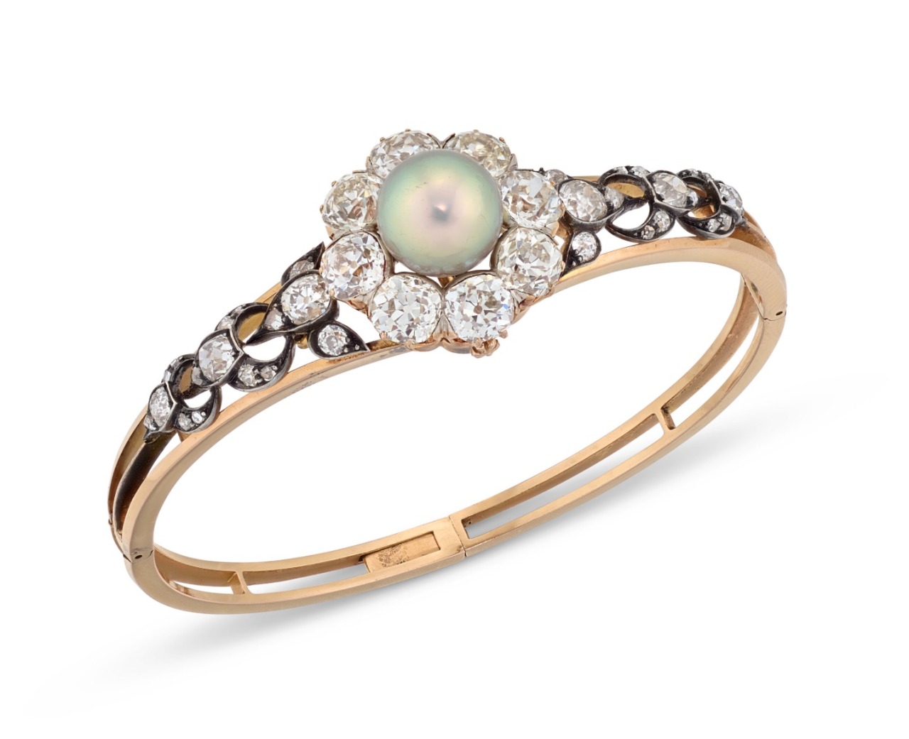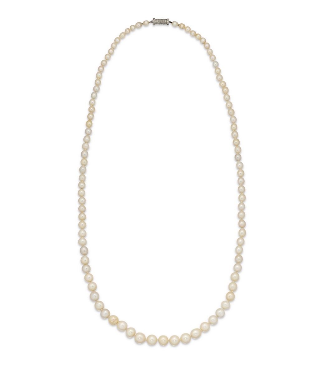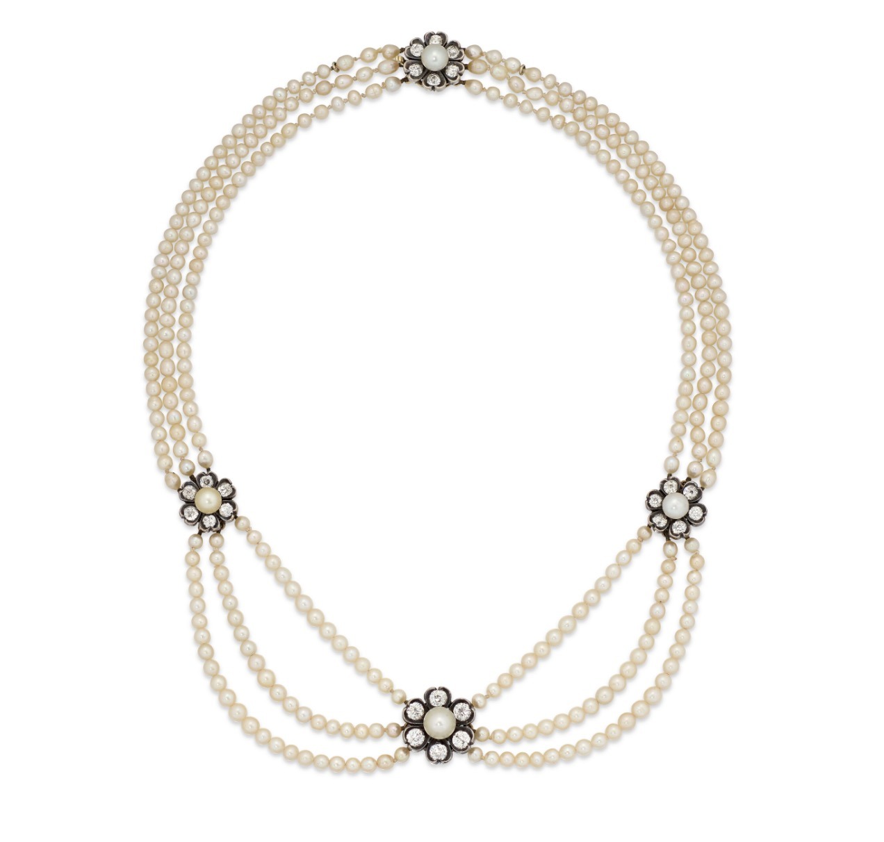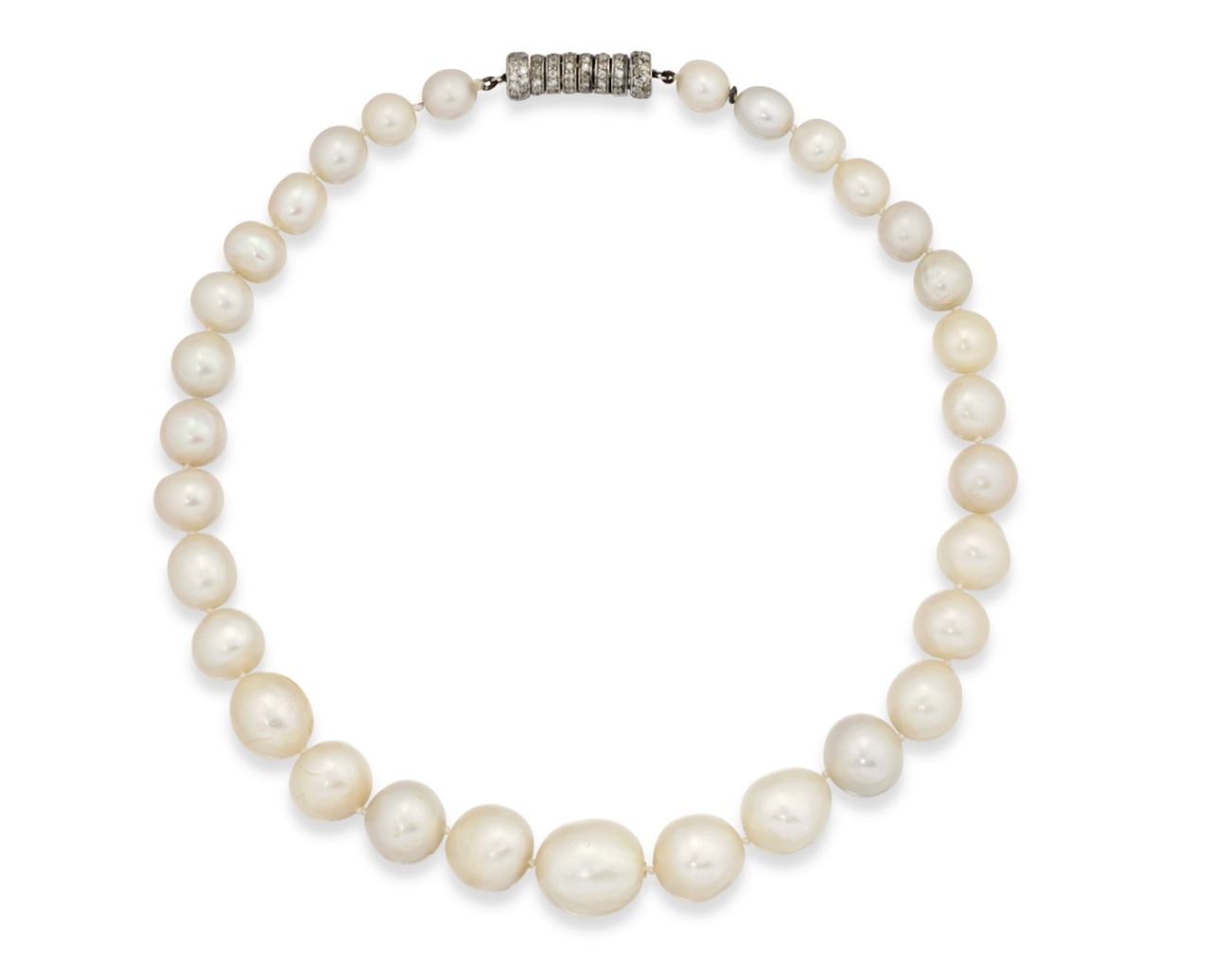 A Natural Pearl and Diamond Necklace with near round and oval-shaped natural pearls ranging from 6.2 to 11.5 – 11.8 mm, single-cut diamonds, circa 1915