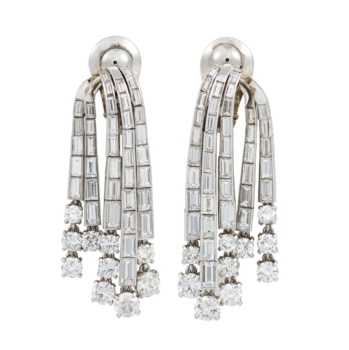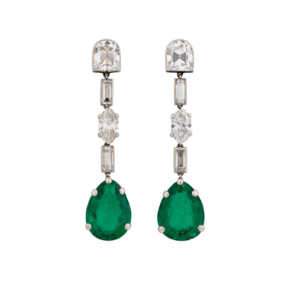 A pair of early 20th century Emerald And Diamond Earrings with pear-shaped emeralds, baguette-, oval- and half moon-shaped diamonds, circa 1920.