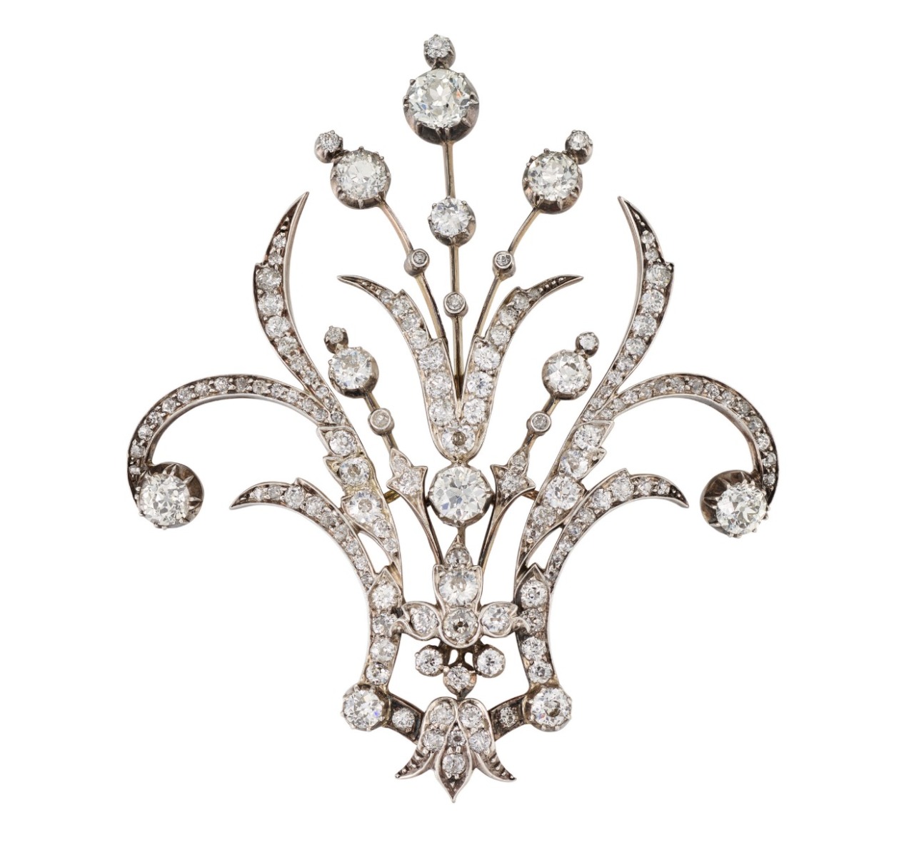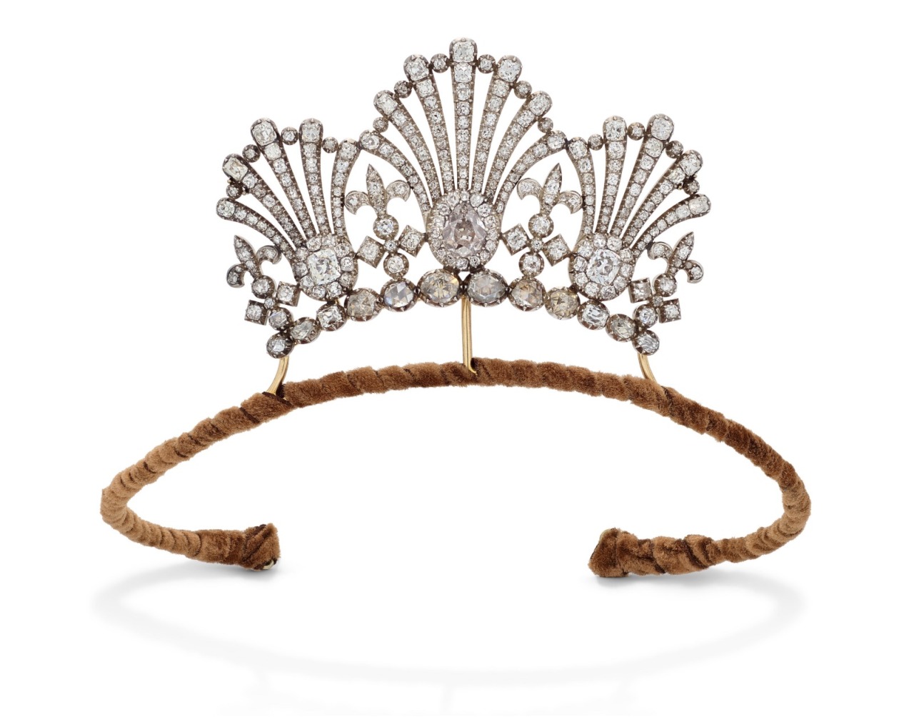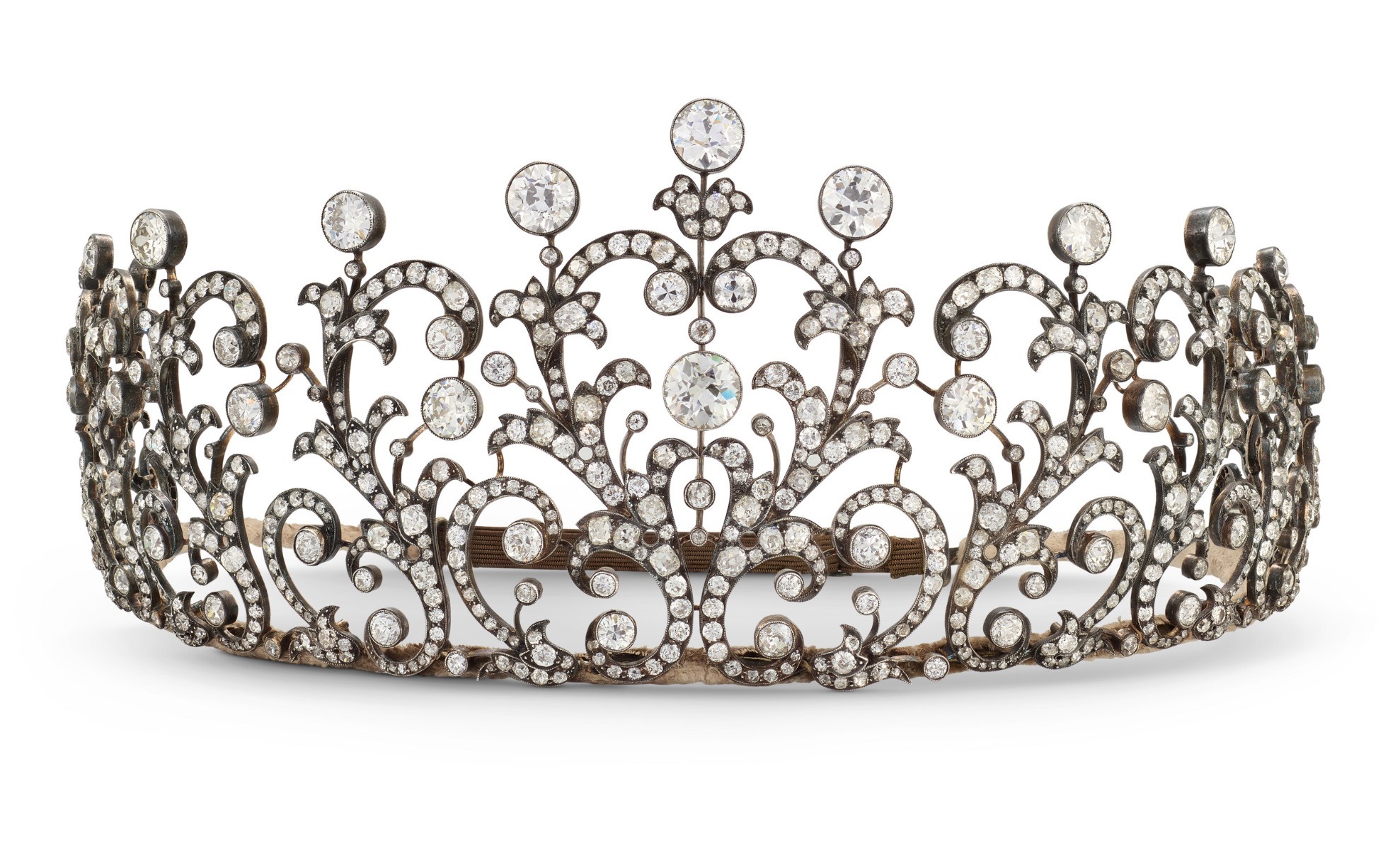 A Diamond Tiara designed as a series of graduating scroll motifs, old circular-, cushion- and rose-cut diamonds, silver and gold, circa 1890.