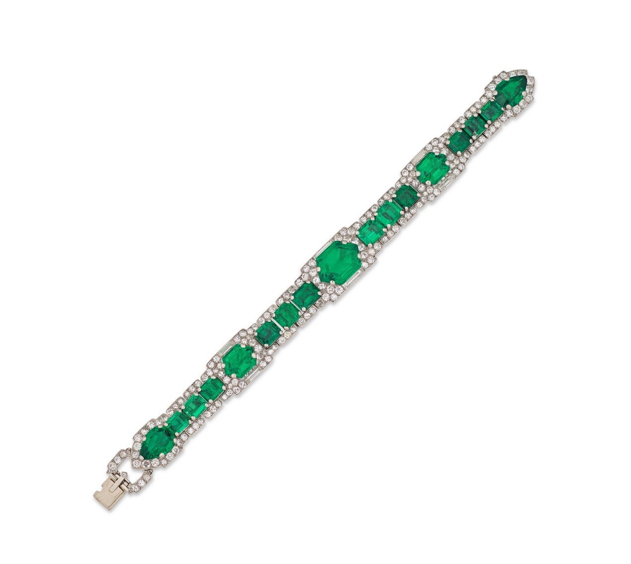 A superb Cartier Art Déco Emerald and Diamond Bracelet with pear-, square-, rectangular- and hexagonal-cut emeralds, old circular-, single- and elongated baguette-cut diamonds, circa 1925, unsigned, fitted red Cartier case.