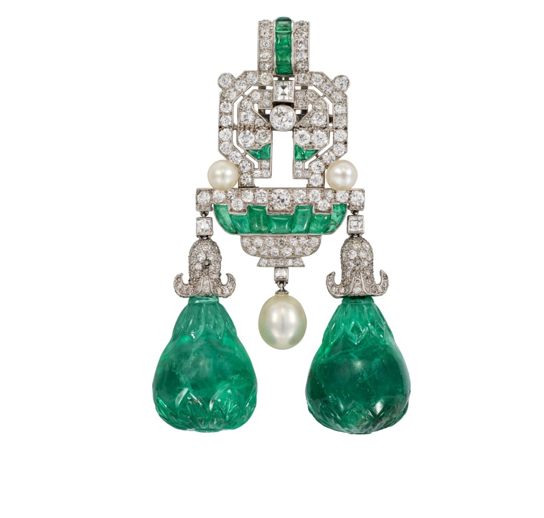 An Art Déco Emerald, Natural Pearl And Diamond Pendant with carved emerald drops and calibré buff-top emeralds, natural pearls, old circular-, single- and carré-cut diamonds, circa 1925.