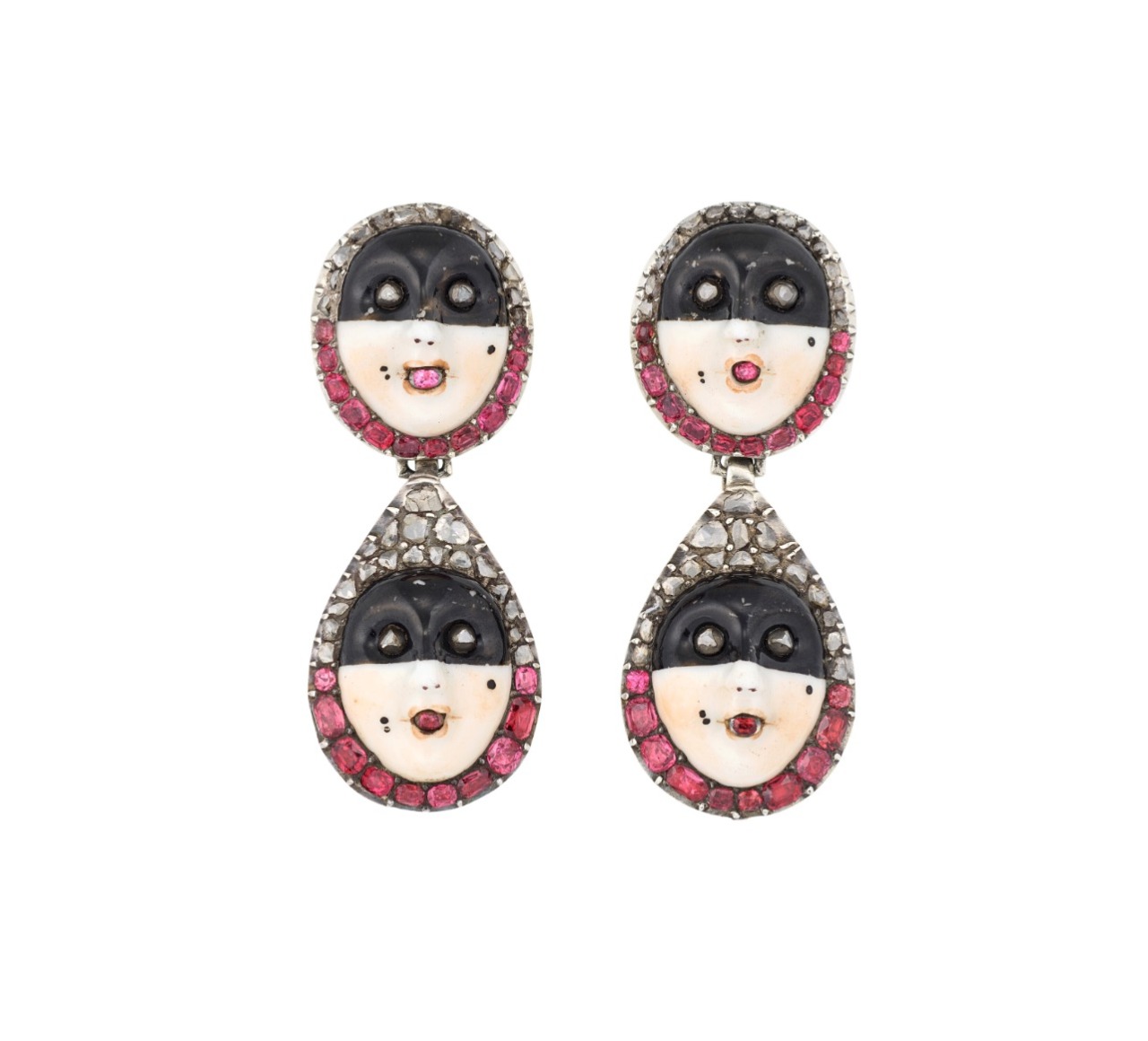 Rare Georgian Porcelain, Diamond And Gem-Set Mask Earrings