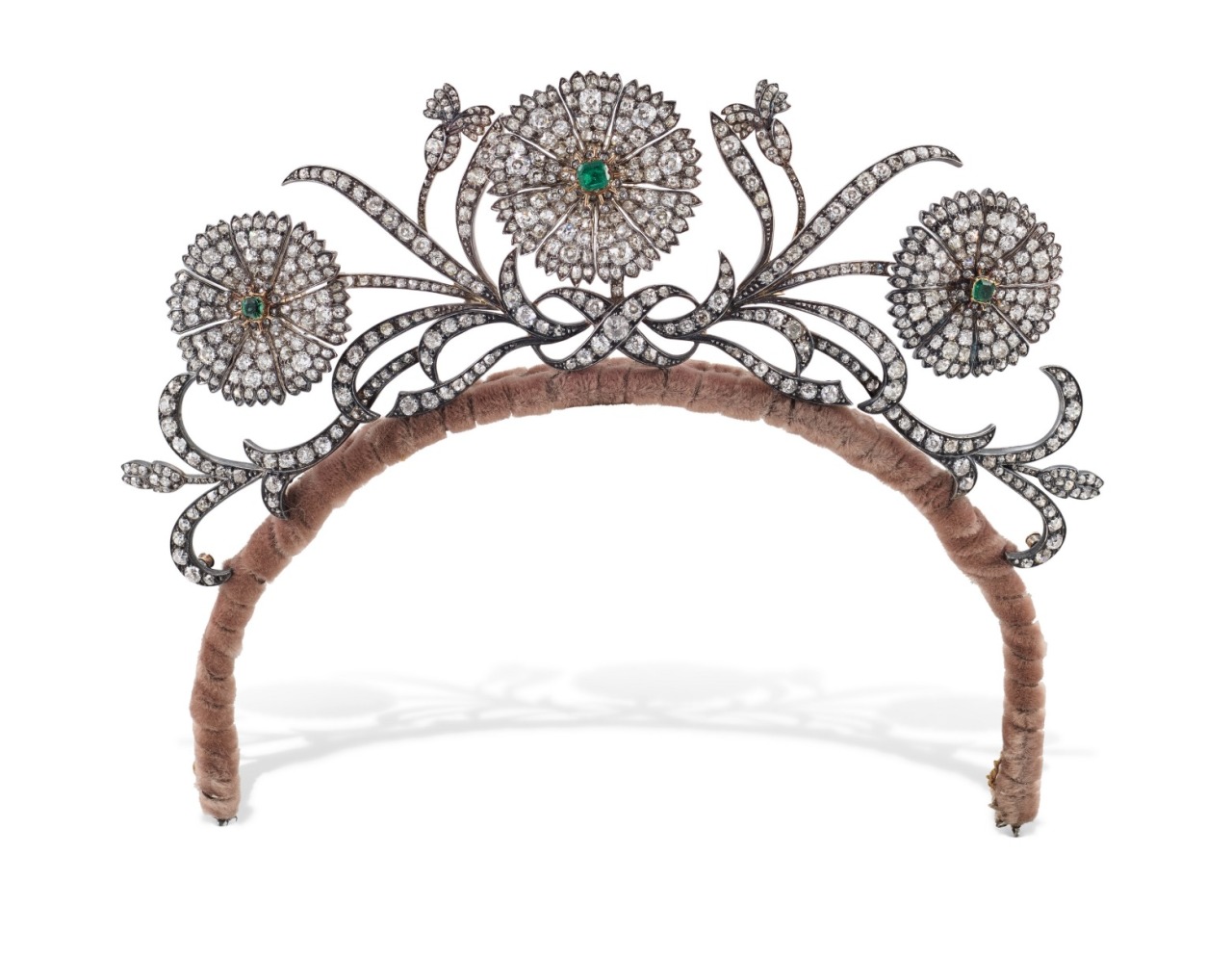 An Antique Diamond And Emerald Tiara of floral and foliate design, old cushion-, circular- and rose-cut diamonds, rectangular cushion-shaped emeralds, silver and gold, circa 1915, composite, some elements possibly earlier, the three flowerheads and bud motifs mounted en tremblant, fitted green Garrard & Co. case.