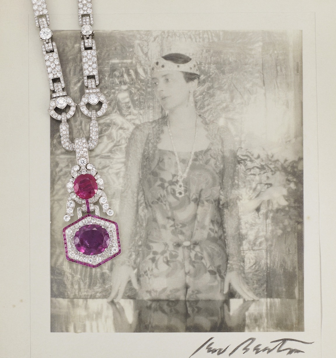 Photographed in 1928, the image known as ‘The Shingled Vicereine’, published in Tatler, depicts Lady Wimborne wearing a Poiret dress and her Art Deco Ruby and Diamond Pendant suspended from a diamond chain, since shortened, as well as her Ruby and Diamond Coronet by Chaumet, sold at Christie’s Geneva on 27th May 1971.