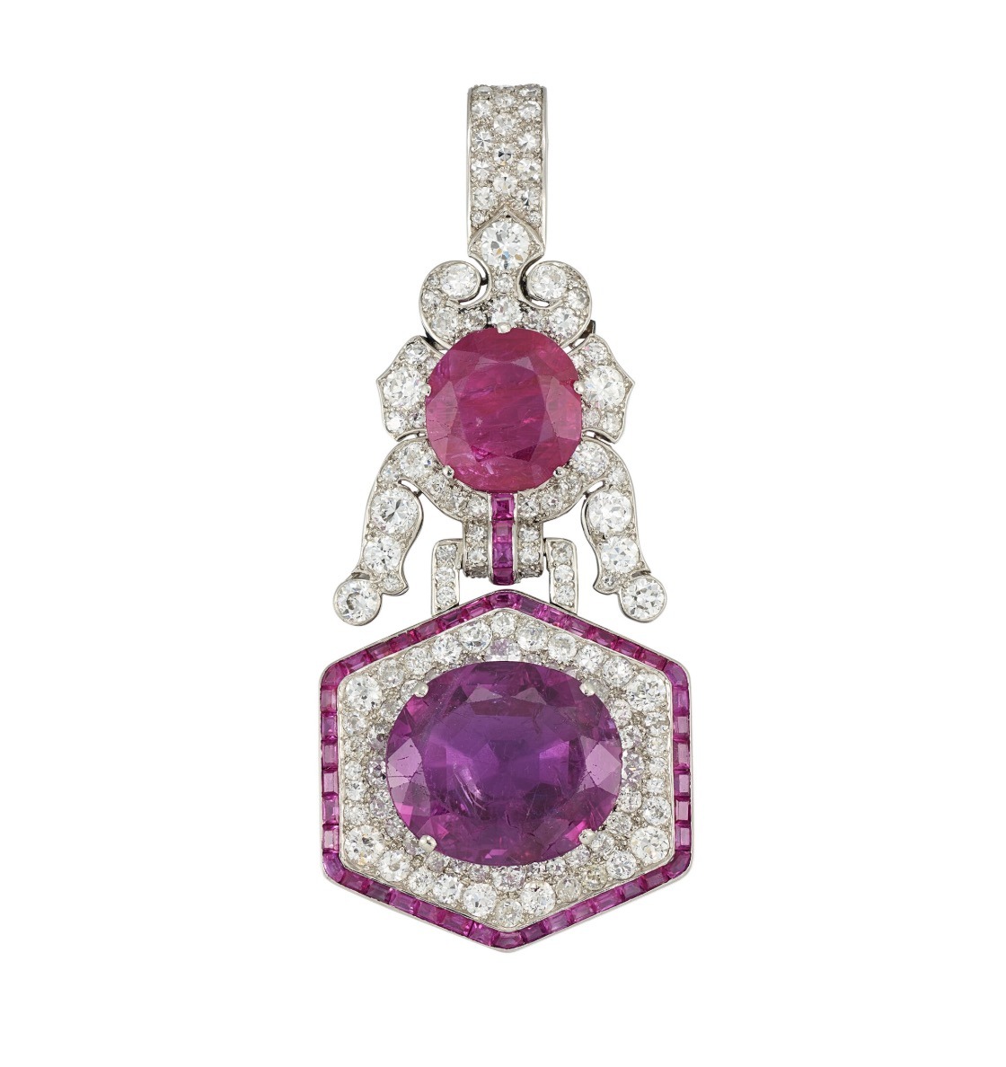 An Art Déco Ruby, Coloured Sapphire And Diamond Pendant with antique cushion-shaped ruby of 8.92 carats, antique cushion-shaped pink sapphire of 21.02 carats, baguette- and calibré-cut rubies, old circular- and single-cut diamonds, circa 1925,