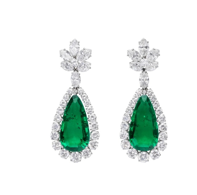 A pair of Bulgari Emerald and Diamond Earrings set with pear-shaped emeralds of 10.58 and 10.06 carats, marquise-shaped and round diamonds, 18k white gold, signed Bvlgari.