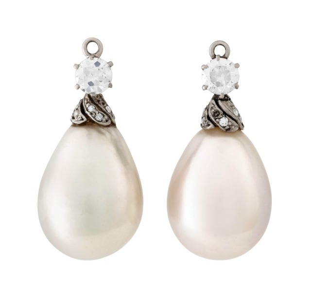 A Natural Pearl and Diamond Pendants with two natural drop-shaped pearls measuring approximately 11.15 – 11.30 x 15.00 and 10.55 – 11.00 x 14.50 mm, old and single-cut diamonds, platinum, 1930s, which can be attached to the previous Ear Pendants.