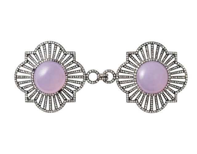 A Fabergé Chalcedony and Diamond Cape Clasp, each clasp of barbed quatrefoil form, centring a large cabochon mecca stone within a rose-cut diamond-set rim, in an openwork rose-cut diamond-set gold mount (Russian marks for St Petersburg), with a hook and loop on each clasp, maker’s mark (August Holmström), St Petersburg, 1899-1903.