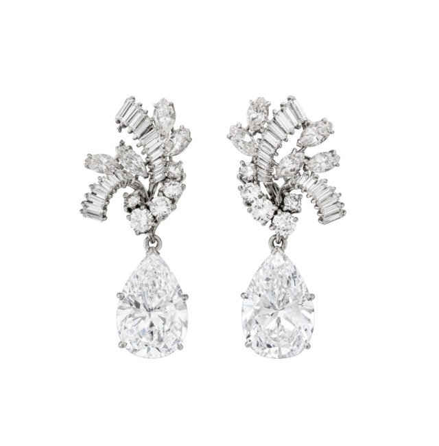 A pair of mid-20Th century Diamond Ear Pendants with pear brilliant-cut diamonds of 8.13 and 8.04 carats, marquise-shaped, baguette-cut and round diamonds, 18k white gold and platinum (French marks), 1950s, pendants detachable and replaceable with the following Pearl Pendants.