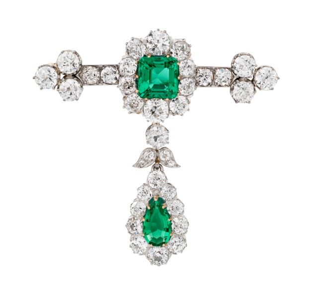 An Emerald and Diamond Brooch/Pendant with octagonal and pear-shaped emeralds of 3.97 and 1.20 carats, old-cut diamonds, silver and gold (French marks), 1890s, detachable central emerald element and emerald pendant.