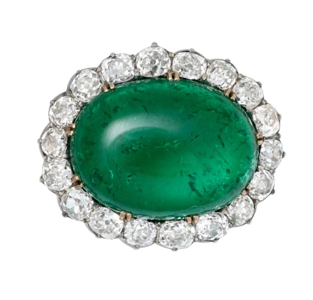 An antique Emerald and Diamond Brooch / Pendant set with an Emerald cabochon of 42.14 carats, old-cut diamonds, yellow gold and silver, circa 1880, red Carl Ernst case.