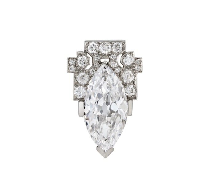An Art Deco Diamond Clip Brooch set with a marquise brilliant-cut diamond of 9.66 carats, round diamonds, platinum and 18k gold (French marks), 1930s, numbered.