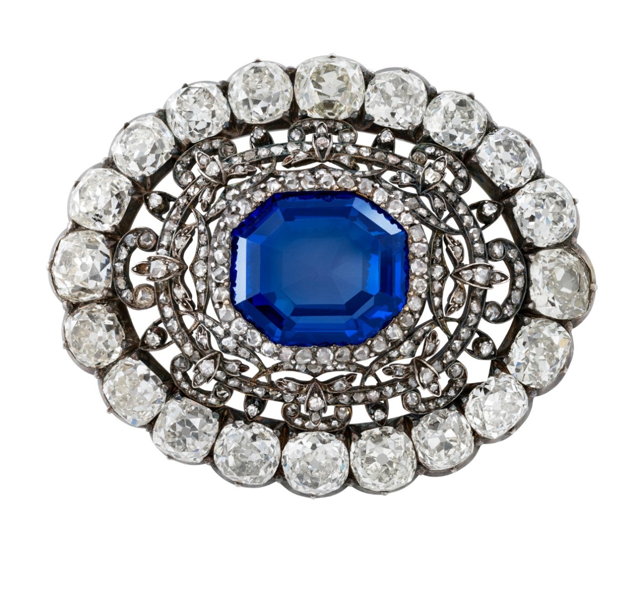 An antique Sapphire and Diamond Brooch, set with octagonal-shaped sapphire, old and rose-cut diamonds, silver and gold, circa 1860. Last worn by Princess Elisabeth of Schleswig-Holstein-Sonderburg-Glücksburg, Princess zu Ysenburg-Büdingen-Wächtersbach.