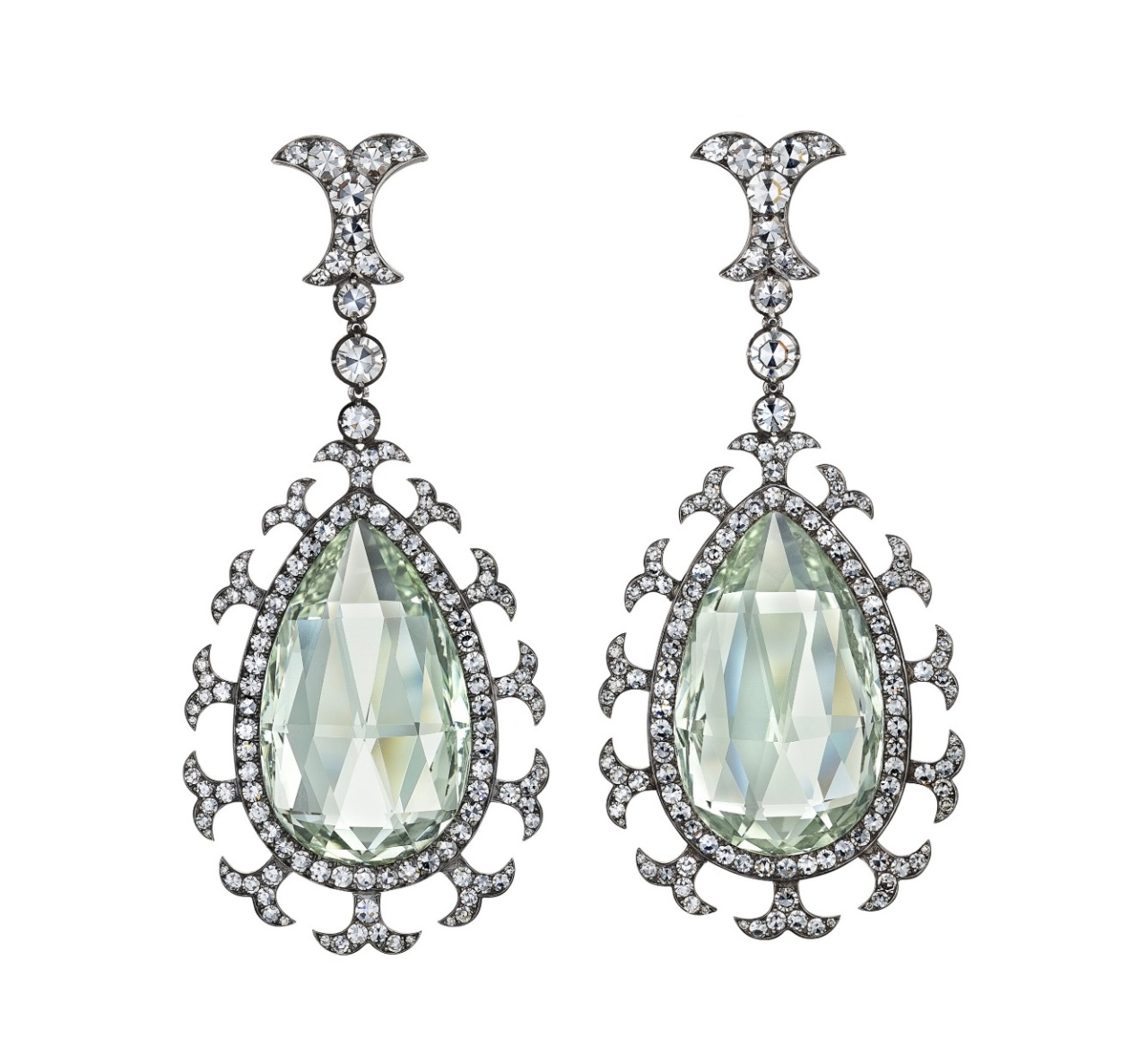 A pair of elegant JAR Green Beryl and Diamond Pendant Earrings with green beryl briolette drops, round diamonds, blackened platinum and 18k yellow gold (French marks), signed JAR, Paris, pink JAR case.