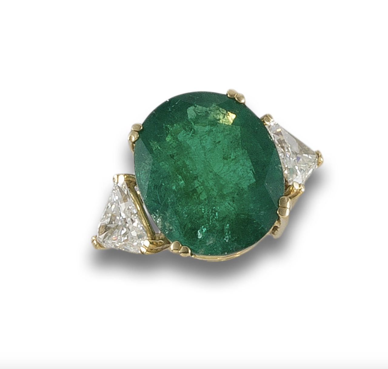 A Gold Ring With 13.36 Ct Emerald, 18K yellow gold ring with a central mixed oval-cut emerald weighing an estimated 13.36 ct, set in prongs, flanked by two trillion-cut diamonds with a total approximate weight of 2.10 ct. Weight: 10.5 g.