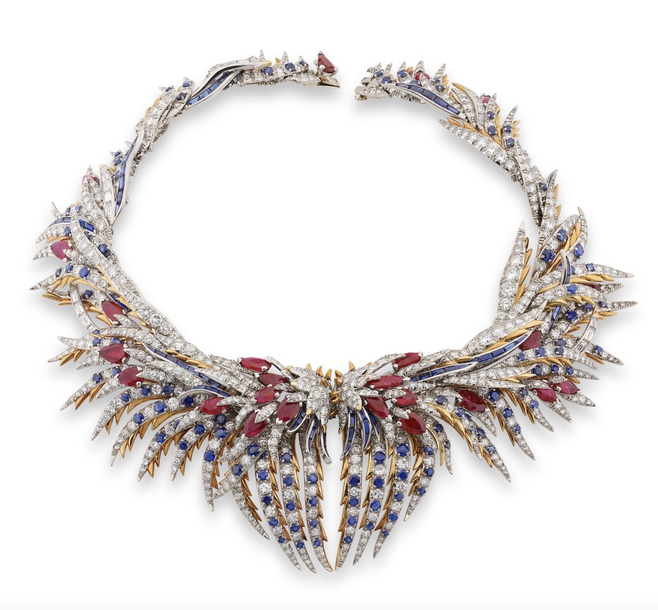 A Schlumberger Ruby, Sapphire and Diamond ‘Plumes’ Necklace, circa 1960, of winged design, set throughout with brilliant-, single-cut and baguette diamonds, highlighted with pear-shaped rubies, circular- and step-cut sapphires, formerly in the collection of Fiona Campbell-Walter, Baroness Thyssen-Bornemisza.