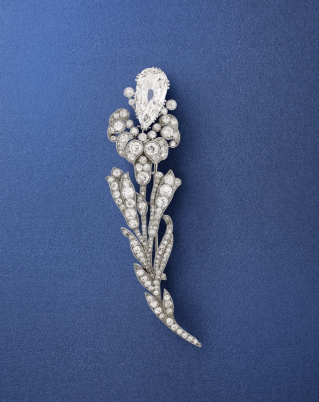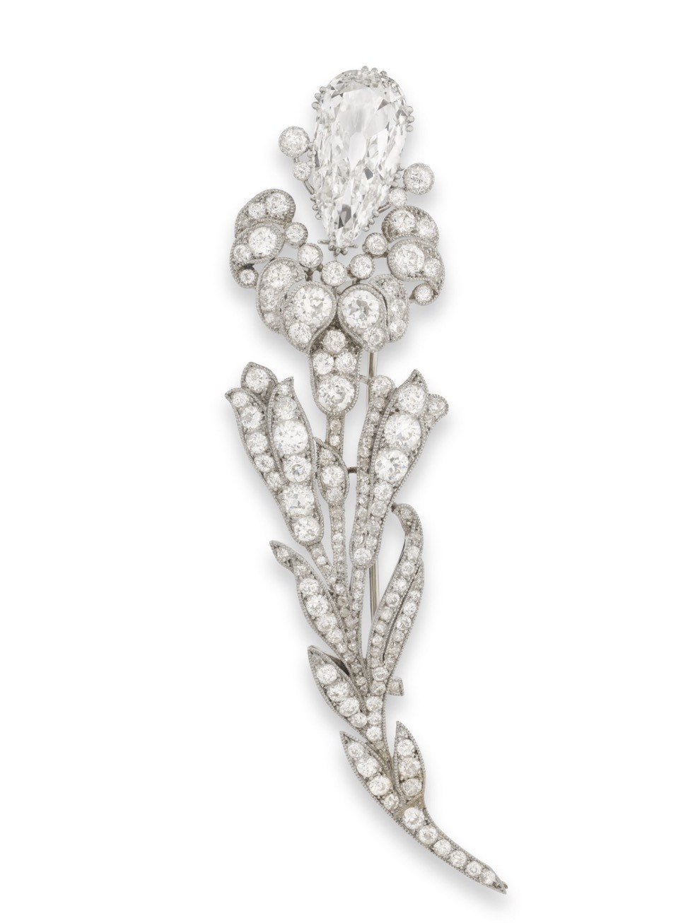 A Cartier Diamond Brooch, designed as a lily spray, set with a pear-shaped diamond weighing 4.55 carats, embellished with circular- and rose-cut diamonds, unsigned, French maker’s mark, with a mechanism allowing the diamond to be detached and worn at the centre of a three-strand cultured pearl necklace.