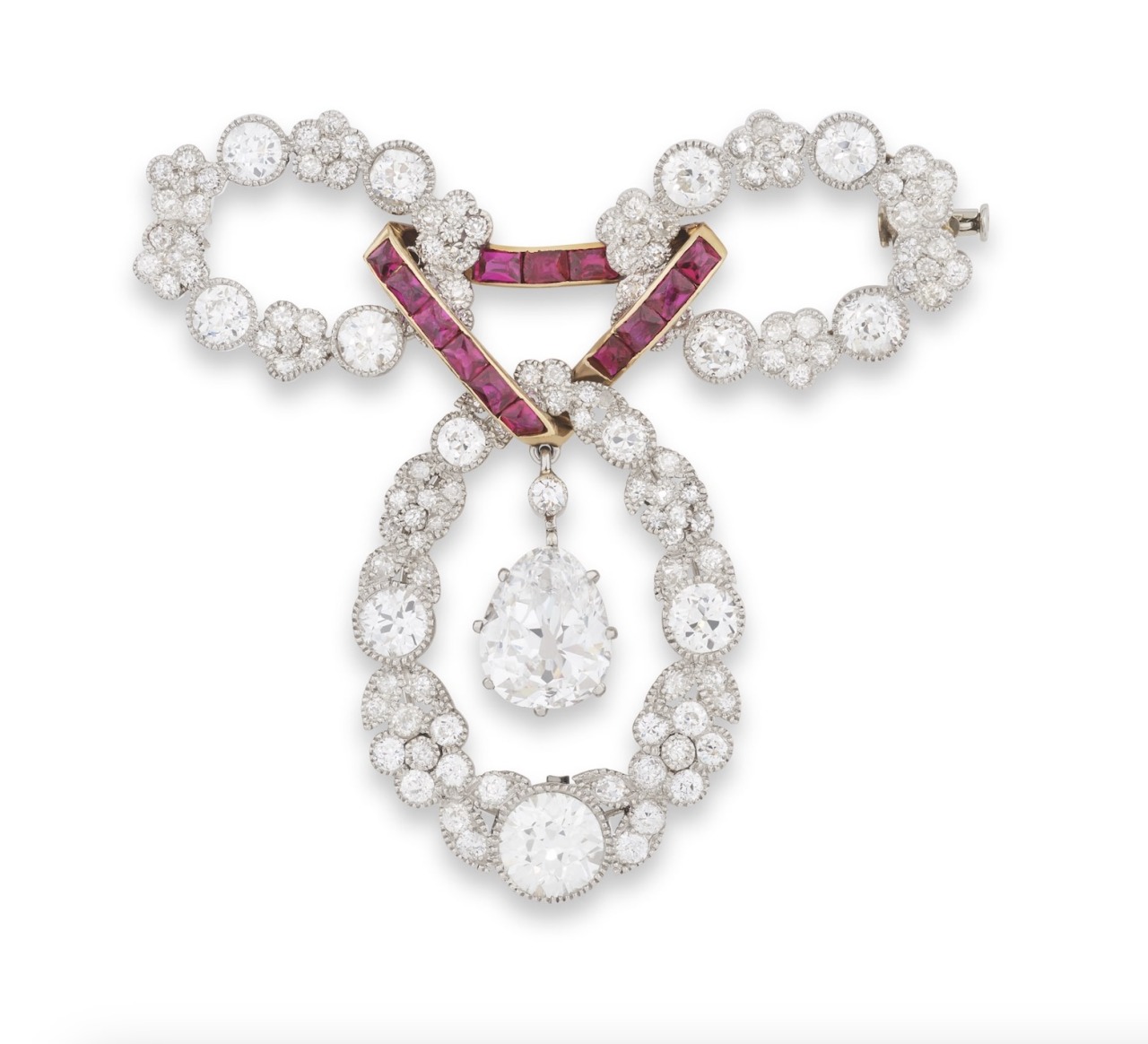 A Diamond and Ruby Brooch of garland design, set throughout with circular- and single-cut diamonds, with calibré-cut ruby accents, supporting a pear shaped-diamond.