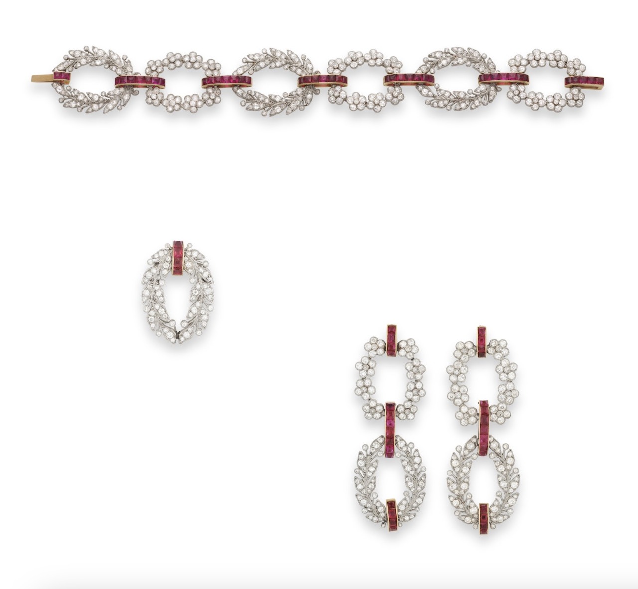 Cartier Ruby and Diamond Bracelet, Earrings and Brooch