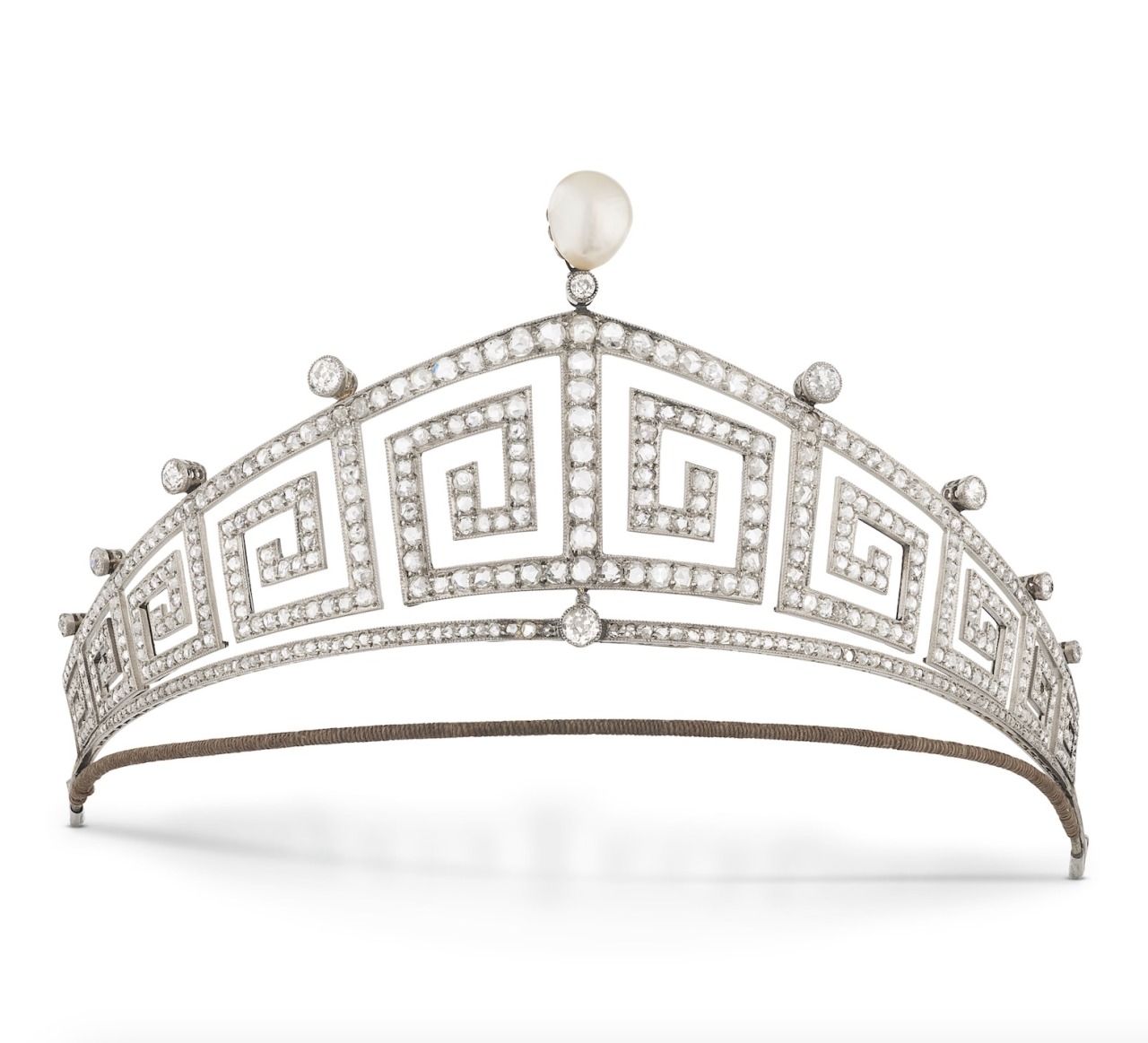 A natural Pearl and Diamond Tiara, early 20th century, of Greek key motif, set with a drop-shaped natural pearl, embellished with circular- and rose-cut diamonds, in a fitted case stamped F Miller Sohn.