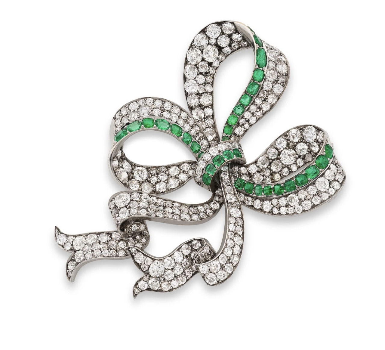 A late 19th century Diamond and Emerald Brooch, designed as a triple bow, set throughout with cushion-shaped and circular-cut diamonds, embellished with step-cut and oval emeralds.