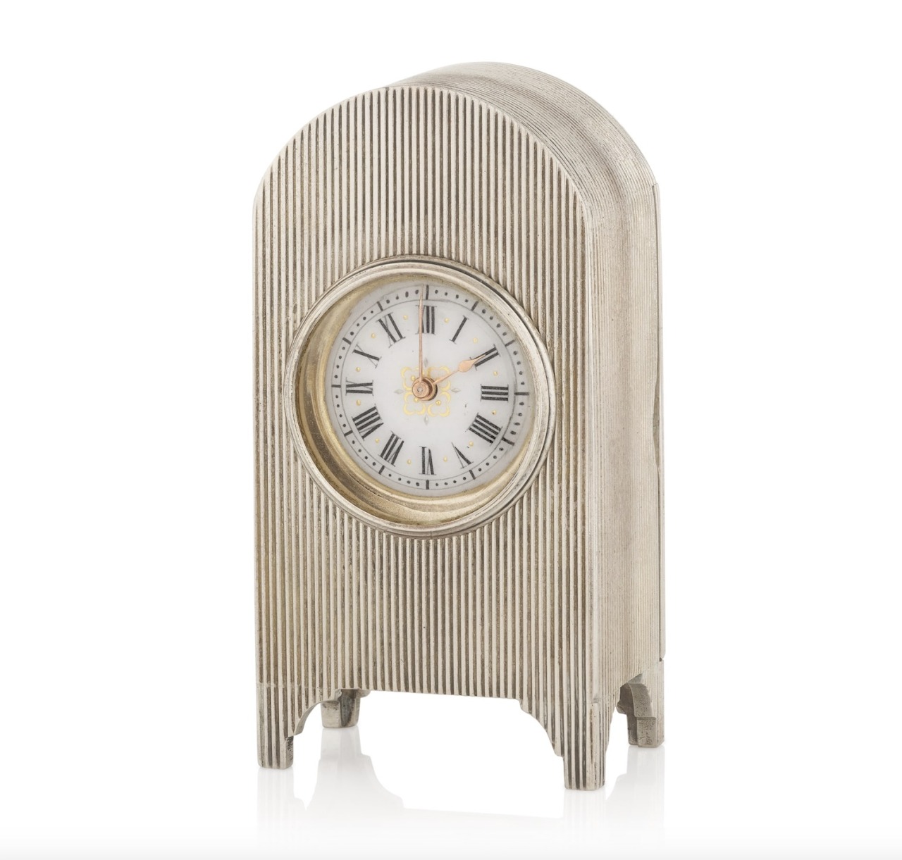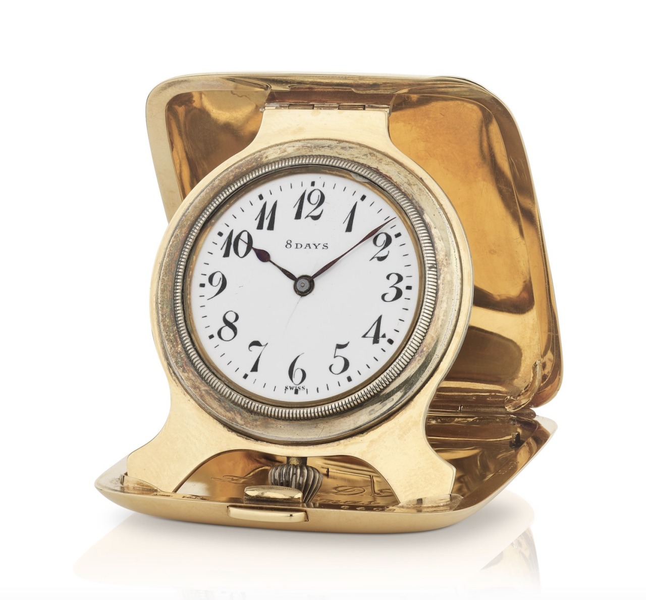 A Cartier Traveling Clock with a charming folding travelling clock with an 8-day mechanical movement, the circular white enamel dial marked ‘8-Days’ with Arabic numerals and blued-steel hands, housed in a gold case, the hinged cover set with a white enamel finely monogrammed ‘G.S.’ for Gladys Vanderbilt (1886–1965), later Countess Széchényi, the interior further inscribed ‘From D.S. Xmas 1913’.
