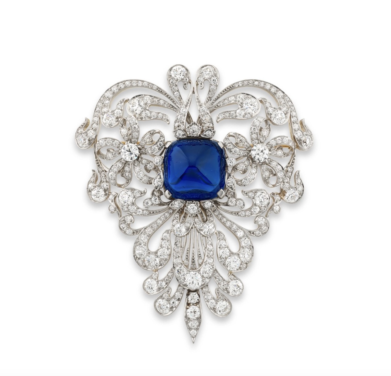The Vanderbilt Sapphire by Tiffany & Co. set an exceptional Kashmir sugar loaf sapphire weighing 42.68 carats, mounted in a diamond-set brooch dating from the early 20th century.