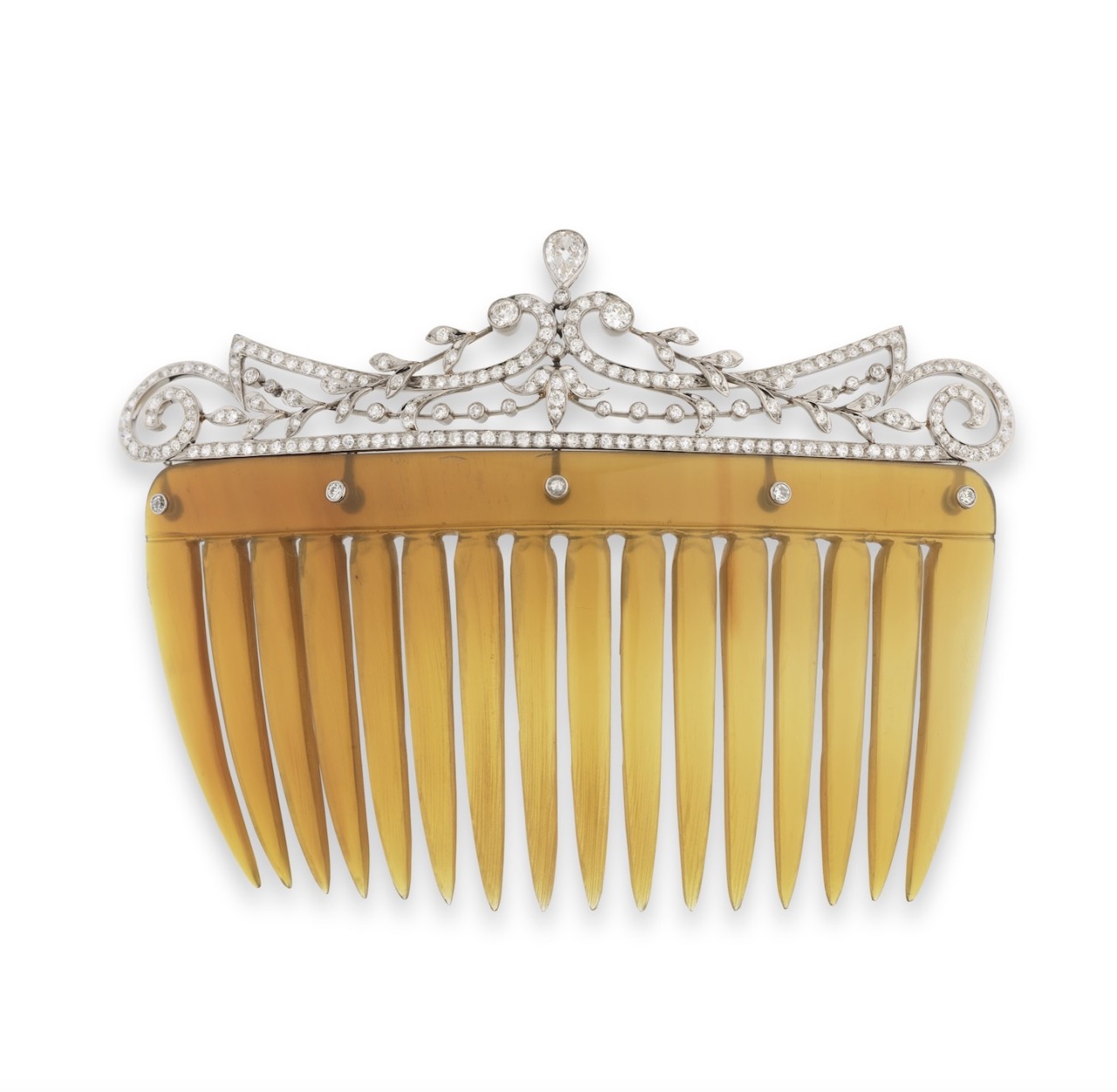 An early 20th century Diamond Hair Comb, of scroll and foliate design, set with a central pear-shaped diamond, further decorated with circular- and single-cut diamonds, attached to a horn comb later replaced, with circular-cut diamond screws.