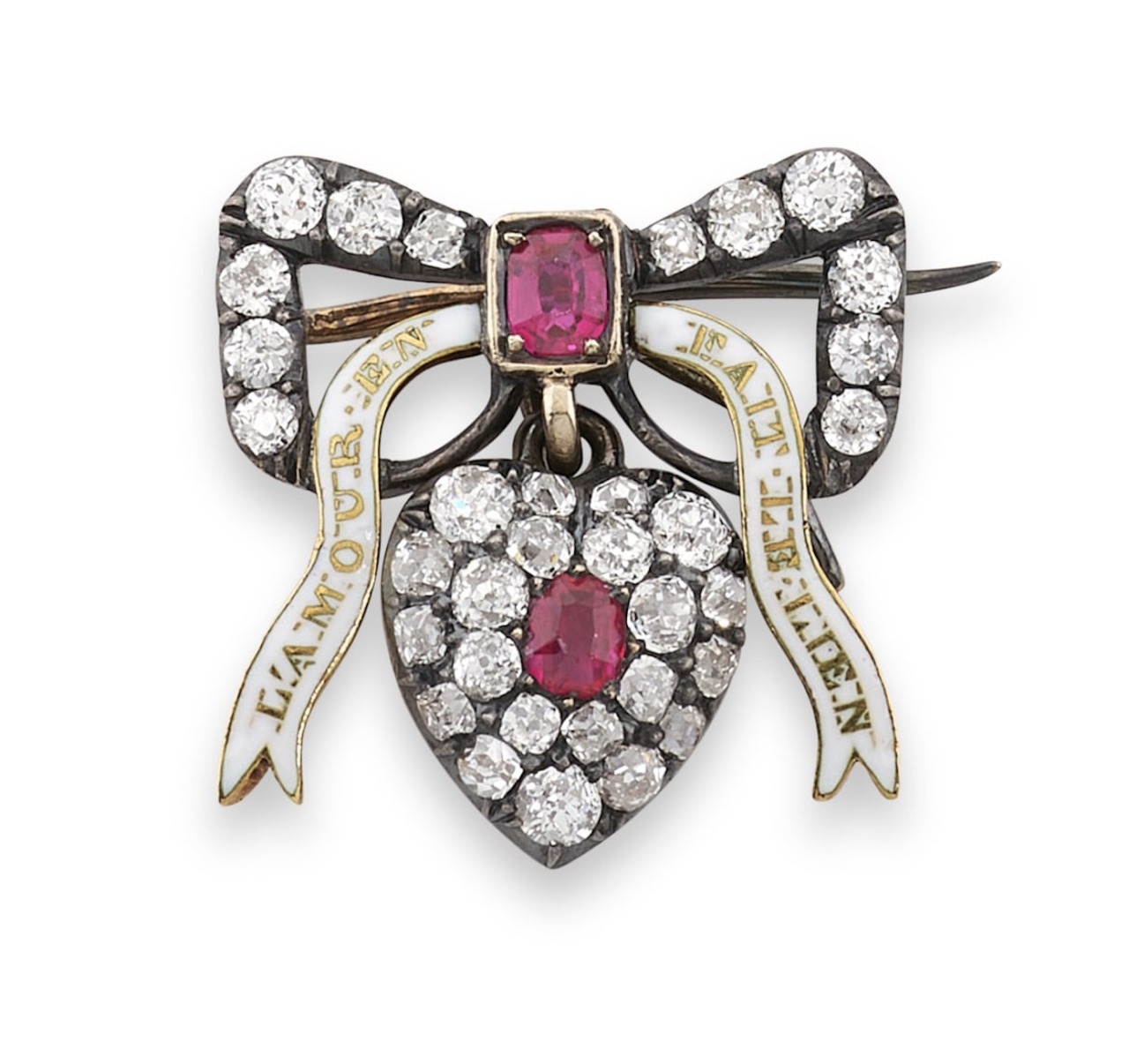 A Ruby, Diamond and Enamel Brooch, first half of the 19th century, designed as a bow, set with an oval ruby, surrounded by cushion-shaped and circular-cut diamonds, applied with white enamel and inscribed ‘L’amour en fait le lien’, suspending a detachable heart decorated with similarly-cut diamonds and an oval ruby.