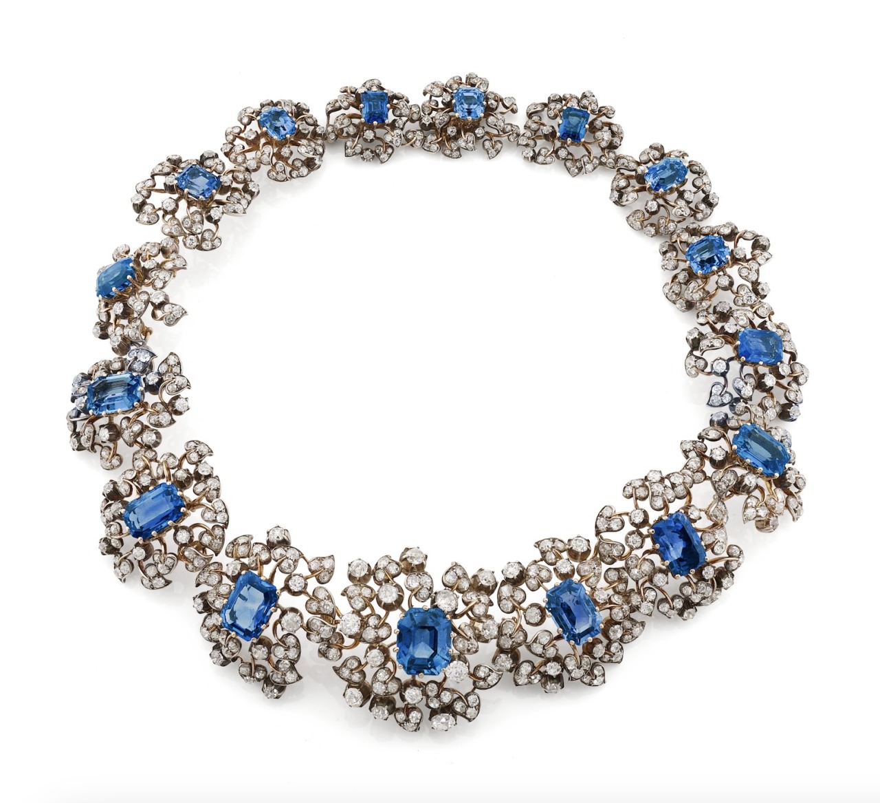 An important Sapphire and Diamond Tiara/Crown/Necklace Combination, second half of the 19th century, of floral design, set with octagonal- and cushion-shaped sapphires, circular-cut and cushion-shaped diamonds, central part detachable and could convert into a tiara, as well as a crown.