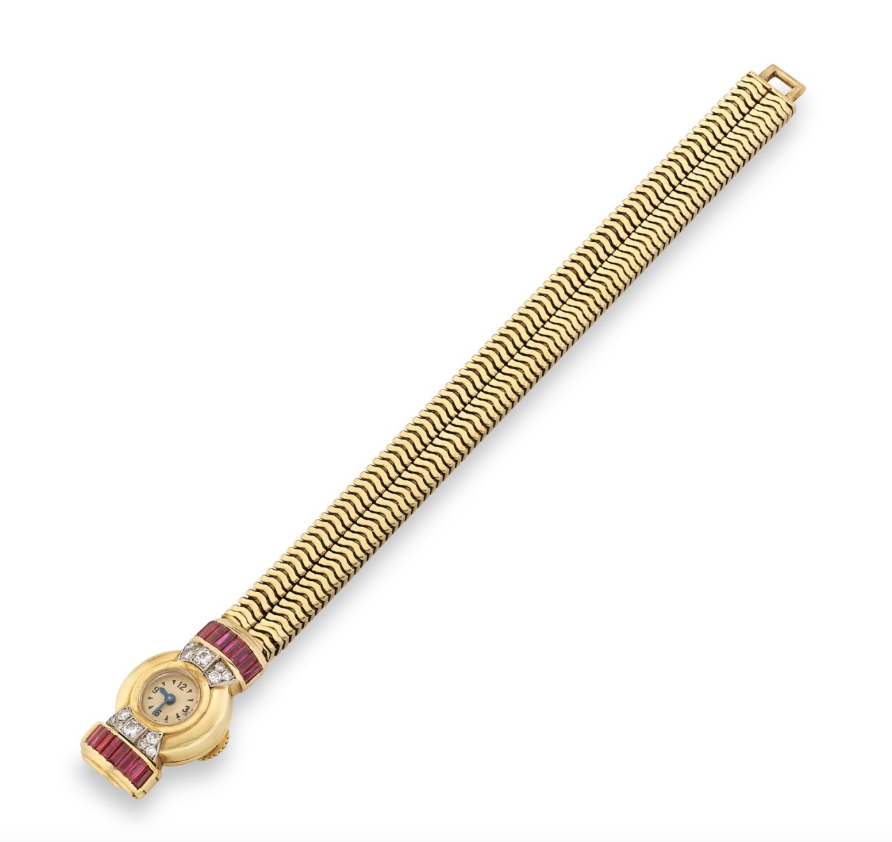 A Cartier Gold, Ruby and Diamond Wristwatch, of mechanical movement, cream circular dial, Arabic numerals at 12, 3, 6 and 9 o’clock, blued-steel hands, decorated with single- and circular-cut diamonds and calibré-cut rubies, the flexible bracelet of serpent style chain.