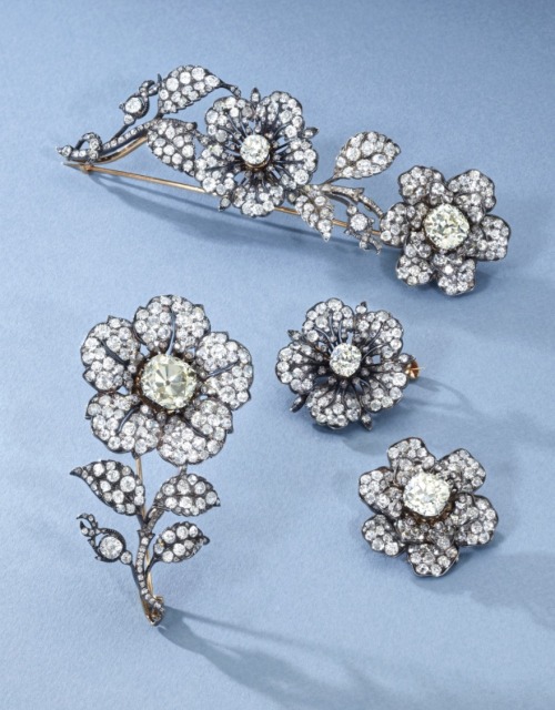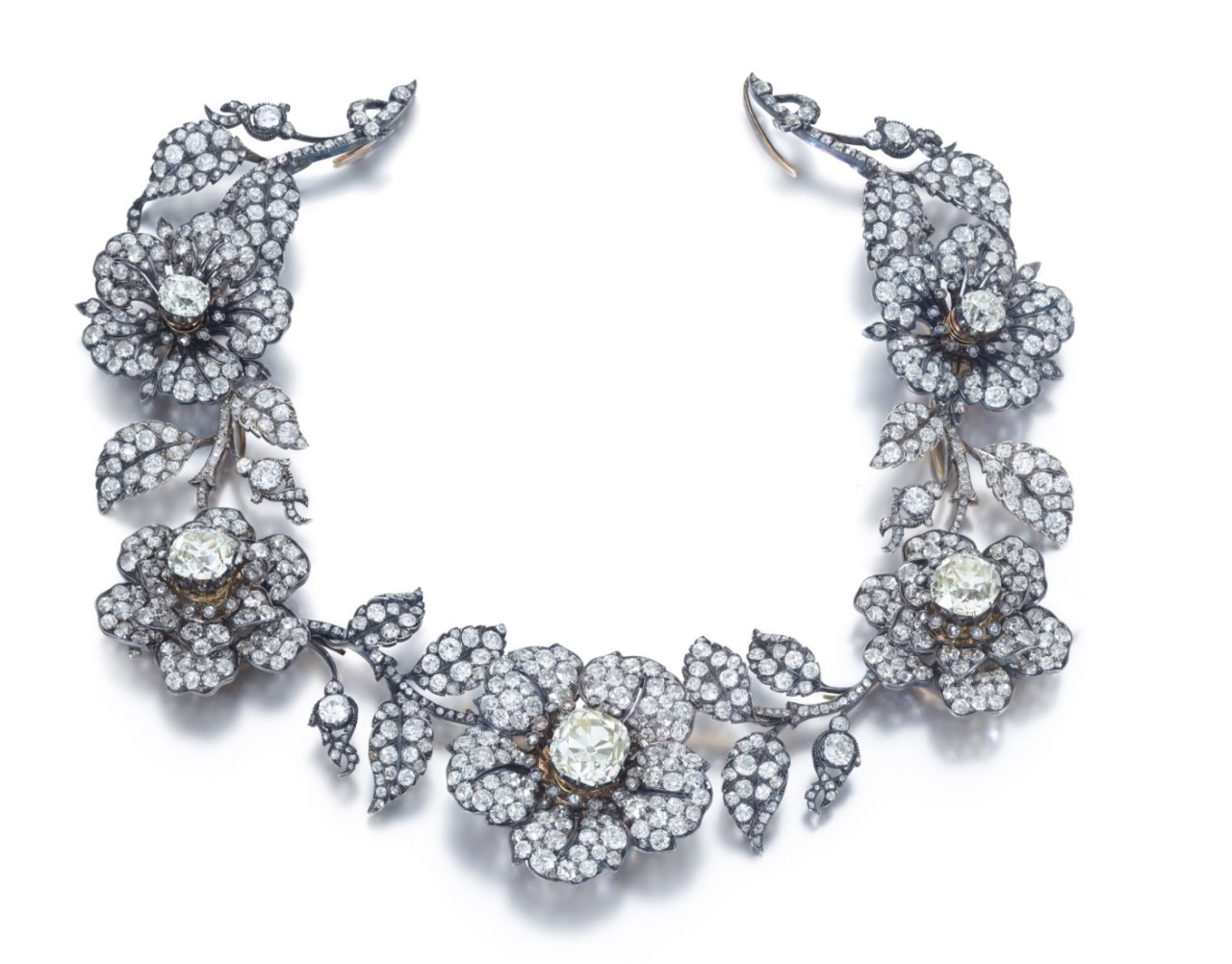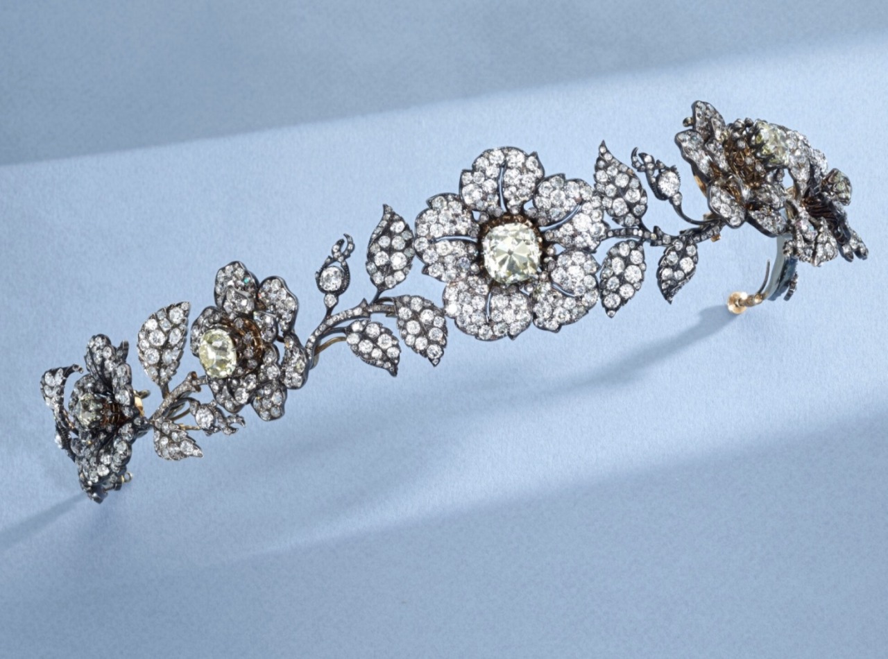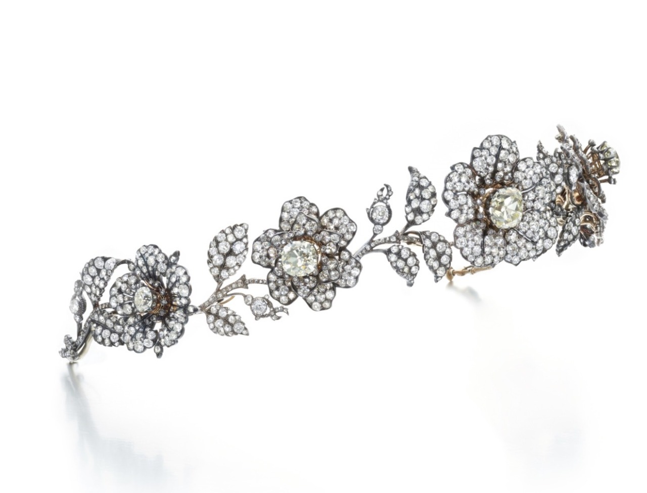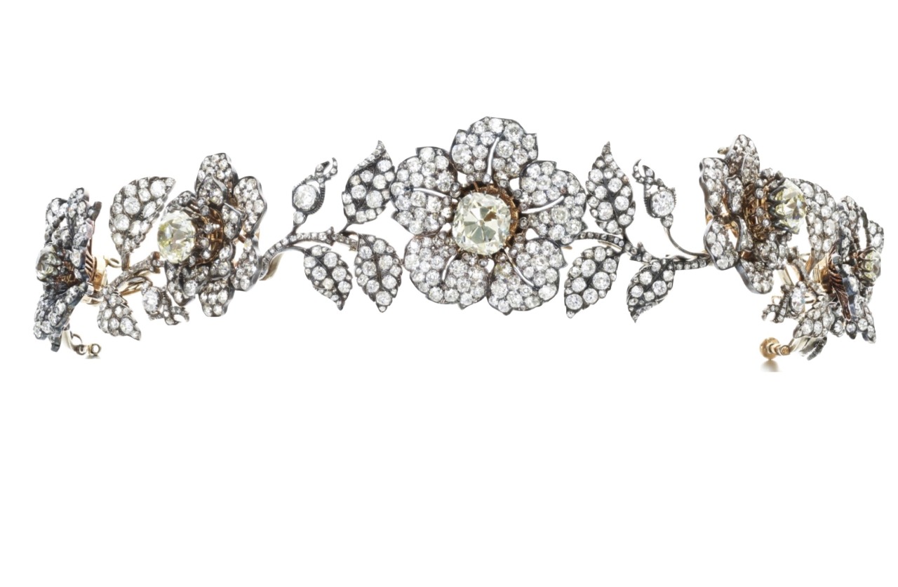 A Diamond Tiara designed as a garland of wild roses, each flowerhead centring a stamen set en tremblant with an old mine-cut diamond framed by rose-cut diamond pistils, the petals, leaves and rose buds pavé-set with similarly shaped diamonds, each element detachable, five brooch fittings, two pairs of later added ear clip fittings, additional later added tiara frame; circa 1840.