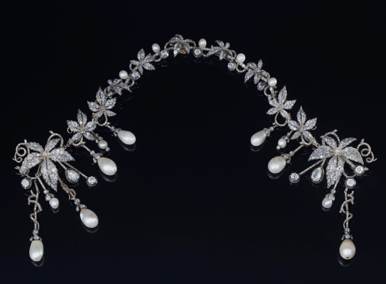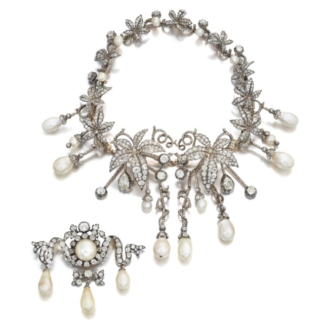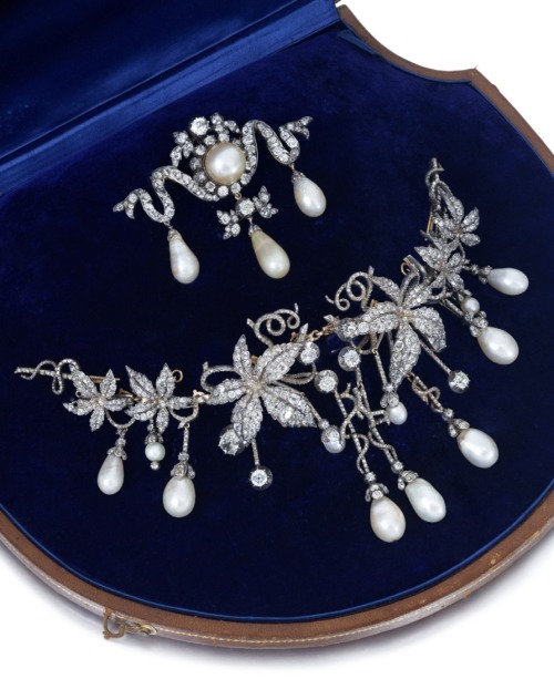 A Rare and Historically Important Natural Pearl and Diamond Jewel and a Brooch comprising: a transformable jewel designed as a graduated garland of vines set throughout with old cushion-shaped diamonds, accented by rose-cut diamonds, suspending a series of drop-shaped and slightly baroque drop-shaped natural pearls each element detachable, various fittings including links connecting the detachable elements, two brooch fittings, six hairpin fittings and two tiara fittings, one pearl pendant deficient, nine small diamonds deficient; and a brooch of ribbon design set with old cushion-shaped diamonds, centring a button-shaped natural pearl.