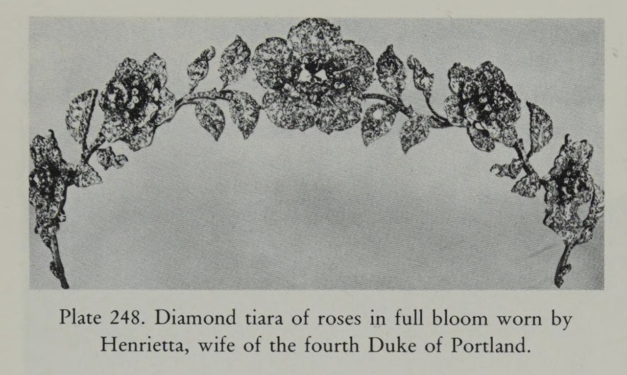 Diana Scarisbrick, Ancestral Jewels, London, 1989, pp. 169 and 170 and plate 248, for this tiara which was sold by the Countess of Norbury who had inherited it from her great-grandmother Henrietta Scott (1774 – 1844) who married the fourth Duke of Portland in 1795. The tiara was sold at Christie’s London on 14 December 1953.