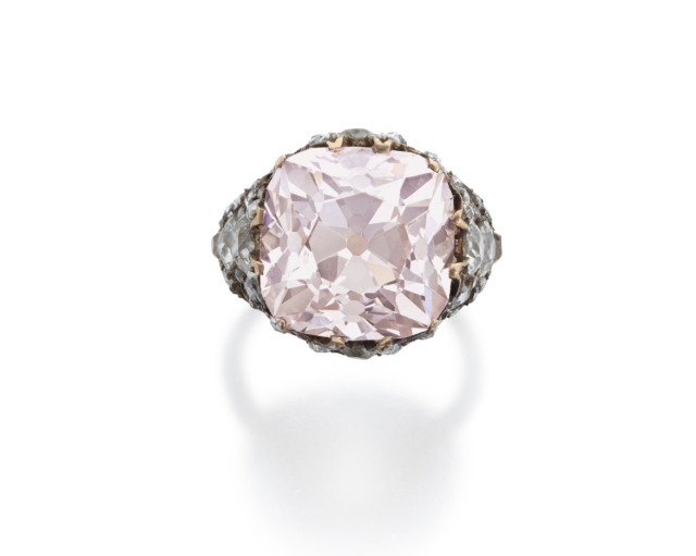 A Light Pink Diamond and Diamond Ring, set with an old mine brilliant-cut Light Pink diamond weighing 13.86 carats, the mount embellished with old mine- and rose-cut diamonds, size 541/2; mid-19th century, with the Pink Diamond originating from Empress Catherine I of Russia.