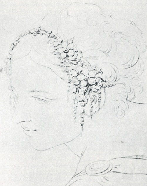 The high point of this style was found in elaborate floral and foliate hair ornaments or coiffures, intended to be worn across the crown of the head and draping over the ears. They were supreme showcases for the jeweller’s virtuosity and created a mesmerizingly ethereal, yet dramatic effect when worn. Vever’s perennial standard work La Bijouterie Française du XIX siècle features several illustrations of variations on this type of jewel. The archives of the former Viennese court jeweller Köchert also contain a number of sketches for intricate examples of the style, which did not survive long past 1850.