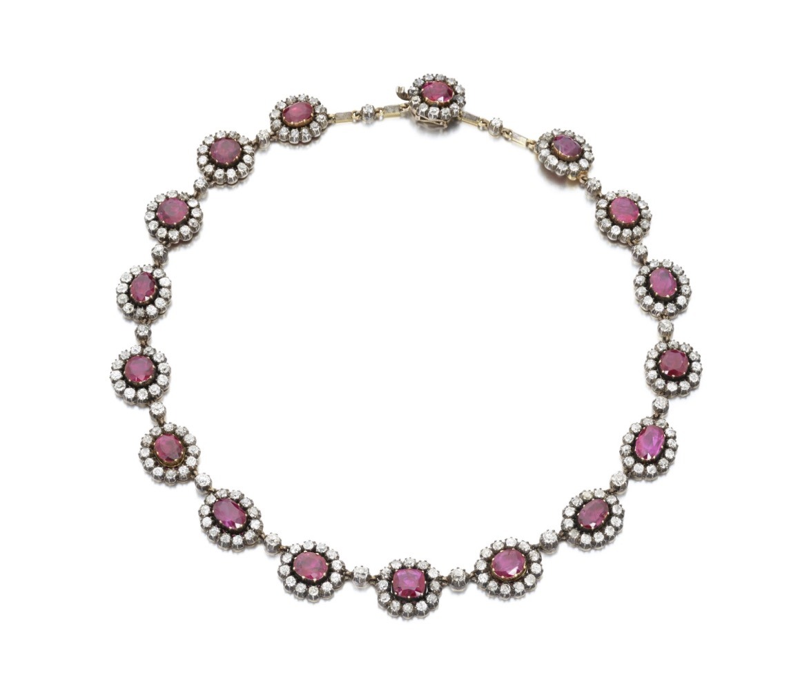 A Ruby and Diamond Necklace centring oval and cushion-shaped rubies within old cushion-shaped diamond borders.Formerly in the Collection of Christian, Lady Hesketh, it was sold in the Noble Jewels Sale at Sotheby’s Geneva, 17 May 2007, lot 329.