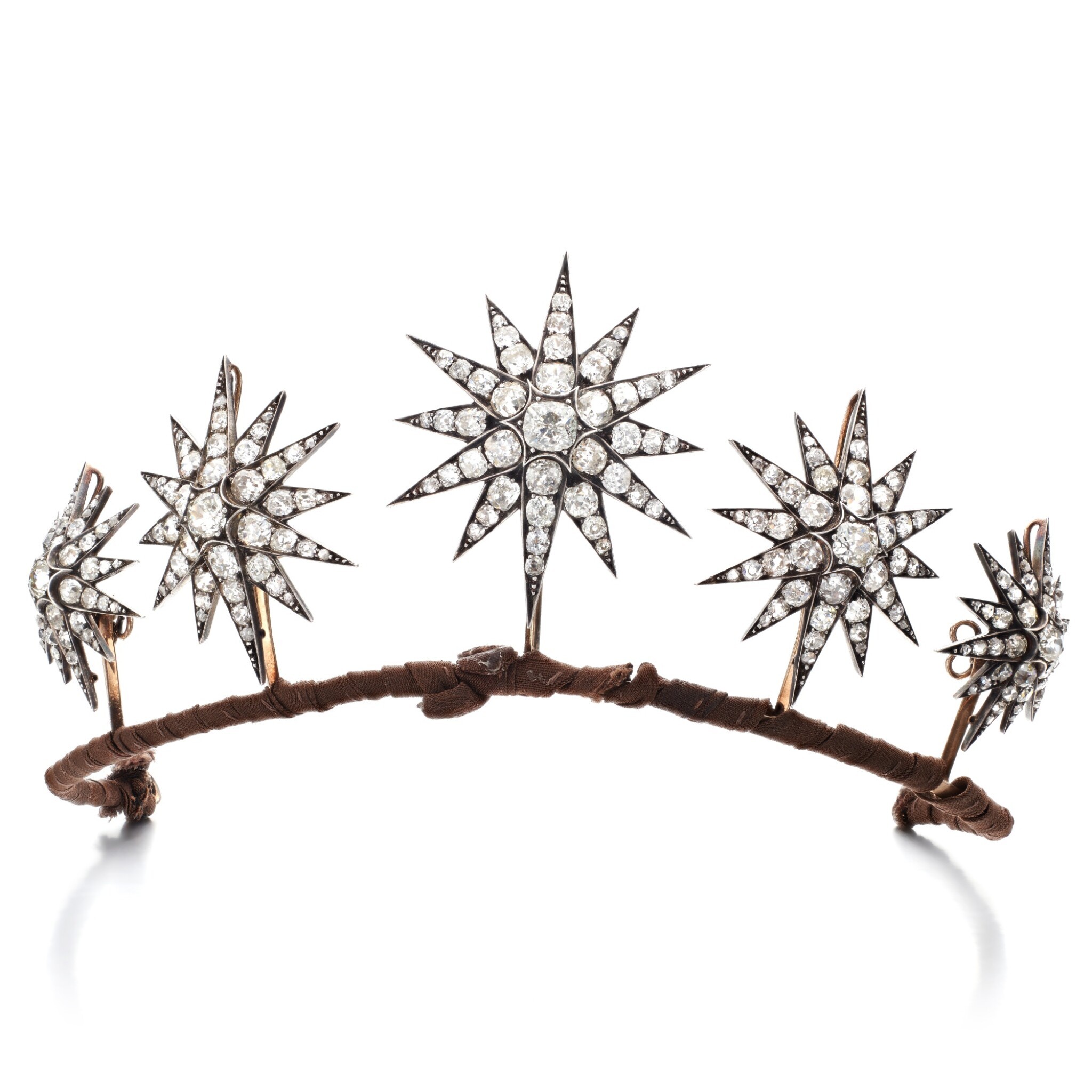 A Diamond Tiara, designed as a graduated series of detachable stars set old mine-cut diamonds, with five brooch fittings from the late 19th century.