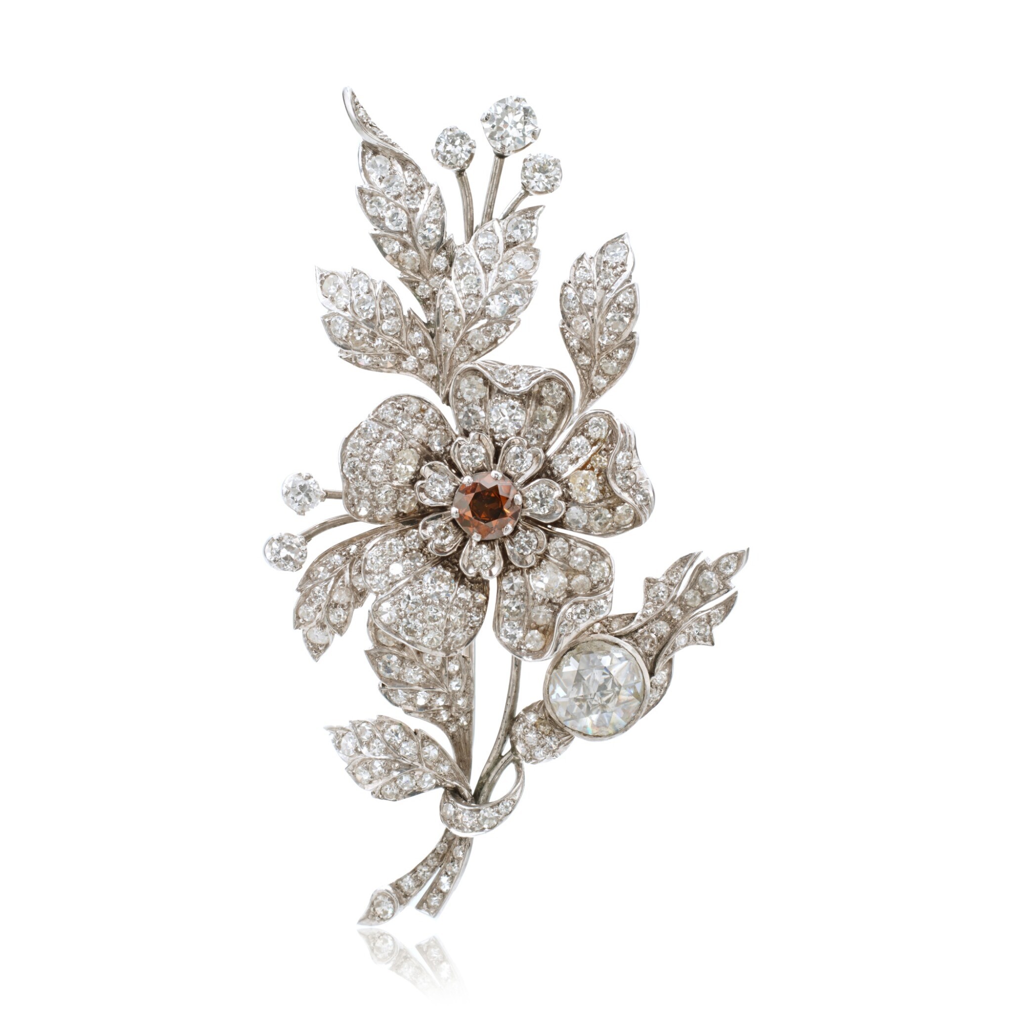 A Coloured Diamond and Diamond Brooch designed as a floral spray set with old European- and single-cut diamonds, featuring a flowerhead set en tremblant, centring a stamen set with a similarly shaped diamond of brown tint, the rosebud collet-set with a rose-cut diamond, from the late 19th century.
