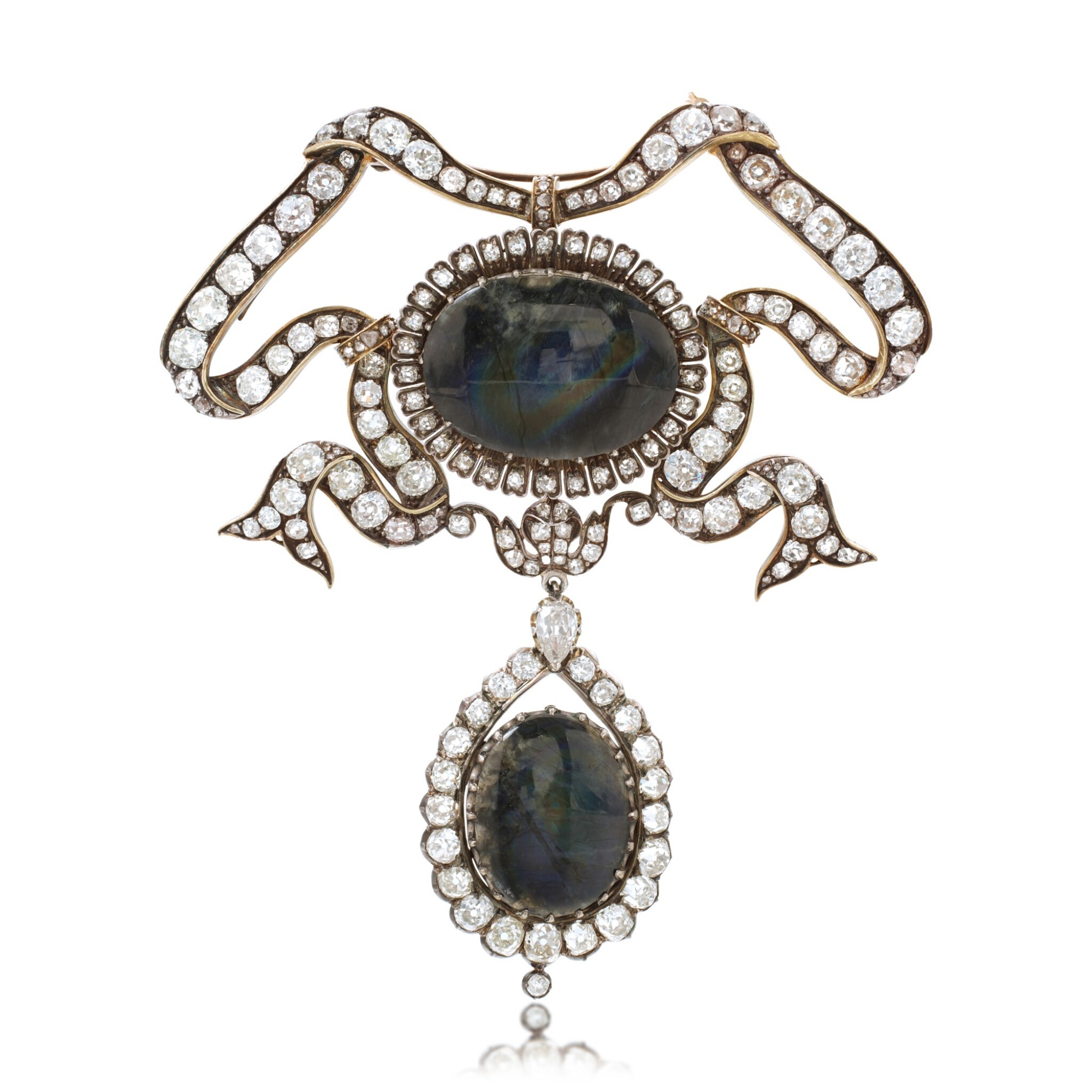A Labradorite and Diamond Devant-de-Corsage designed as a bow set with old mine-cut diamonds centring a cabochon labradorite, suspending a similarly set detachable pendant further enhanced with a pear-shaped diamond, accented by rose-cut diamonds, circa 1880.
