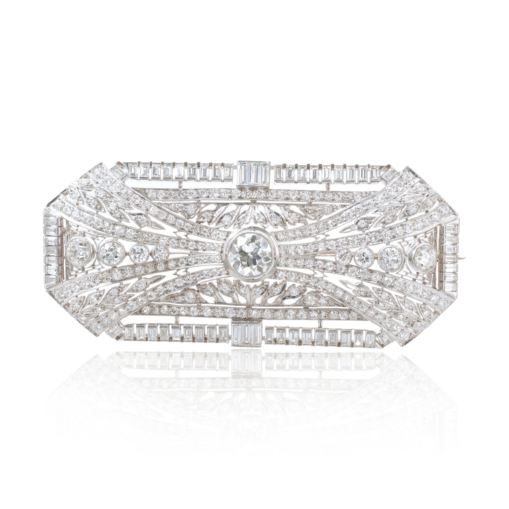 A Diamond Brooch, the slightly bombé openwork plaque of combined foliate and geometric design, millegrain-set with old European- and single-cut diamonds, accented by baguette diamonds, 1920s.