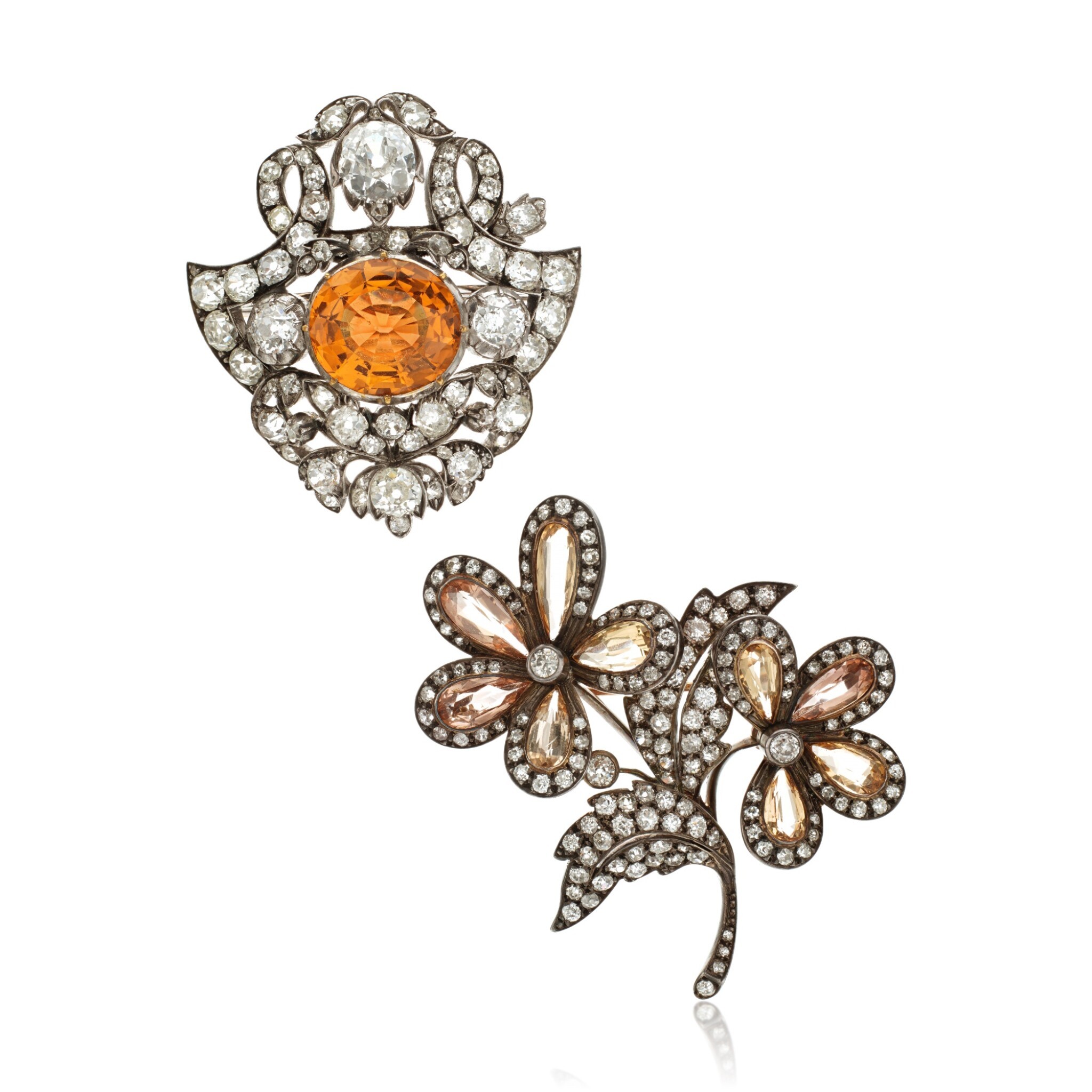 Two Topaz and Diamond Brooches comprising: a shield-shaped brooch centring a collet-set oval topaz within a surround of old mine- and single-cut diamonds; and a brooch designed as a floral spray set with pear-shaped topazes and circular- and single-cut diamonds, 19th century.