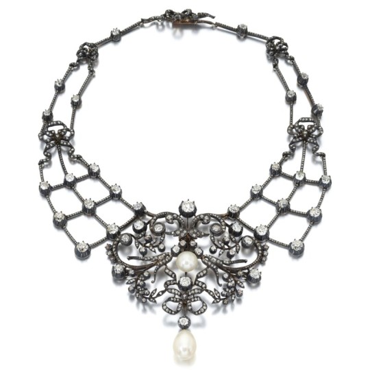 A Natural Pearl, Cultured Pearl and Diamond Necklace, the front featuring a detachable openwork plaque of foliate design set with old mine- and rose-cut diamonds, centring a button-shaped natural pearl and suspending a drop-shaped cultured pearl, to a graduated trellis of knife-edge linking decorated with bows and set with similarly shaped diamonds, circa 1880.