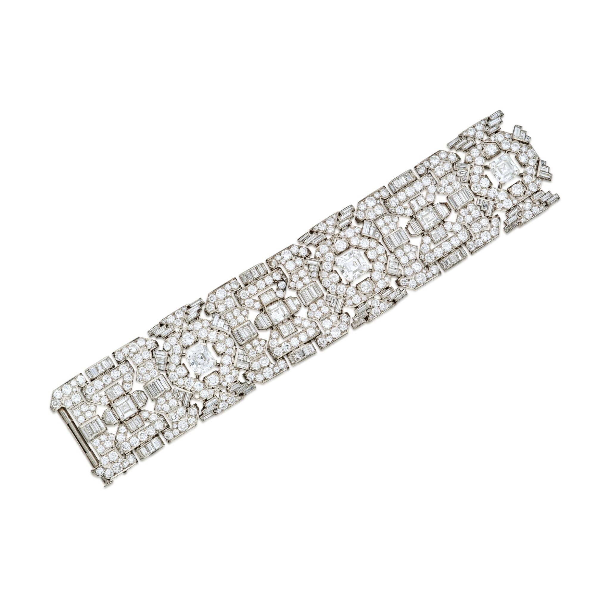 A Mauboussin Diamond Bracelet of openwork geometric design, set with square emerald-cut, square-cut, trapezoid-shaped, old European-cut and baguette diamonds, length approximately 7 inches, signed Mauboussin France, three small diamonds missing; circa 1930.