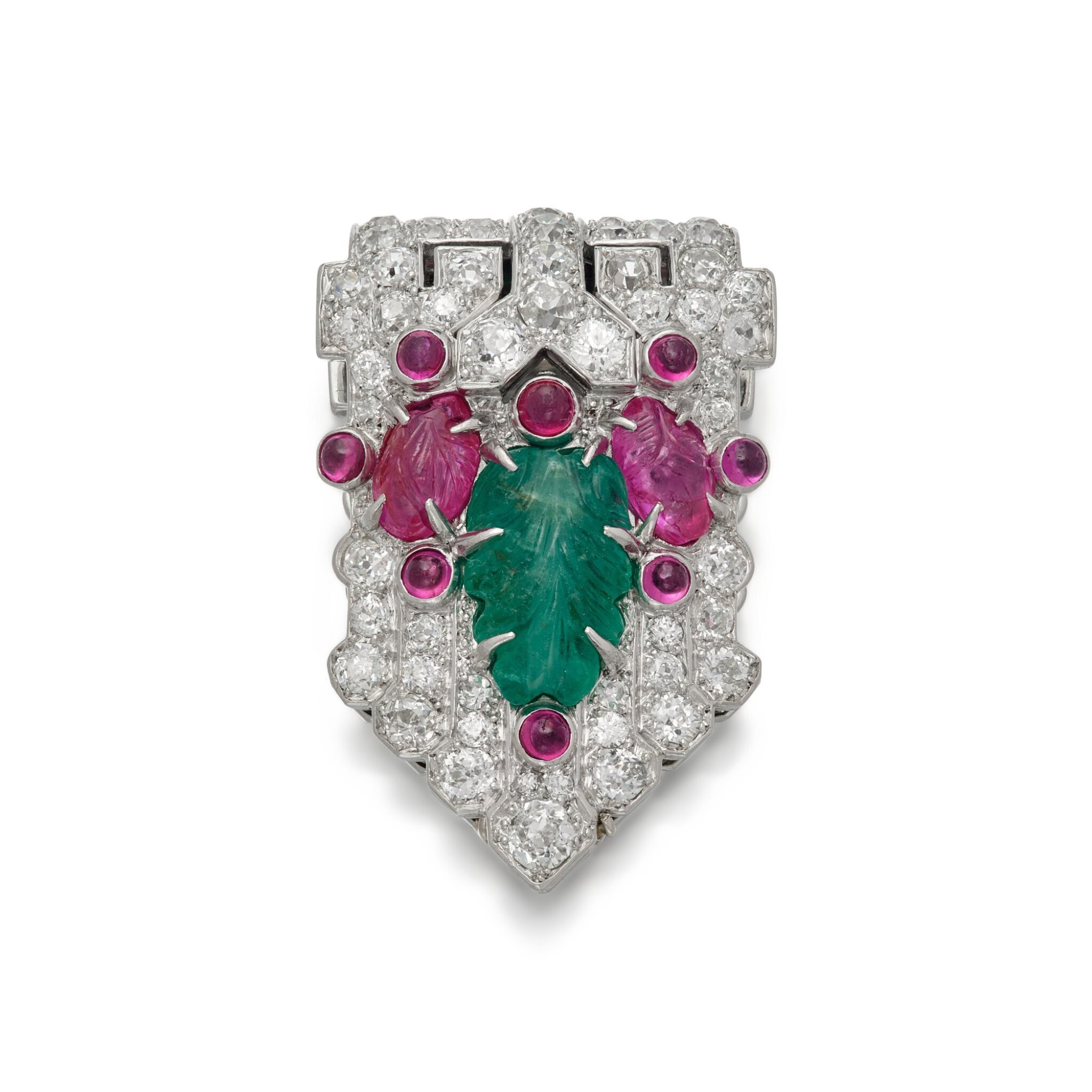 A Cartier Emerald, Ruby, and Diamond ‘Tutti Frutti’ Clip, of geometric design, centering a carved emerald, accented by carved and cabochon rubies, within a surround of old European- and single-cut diamonds, signed Cartier; circa 1930.