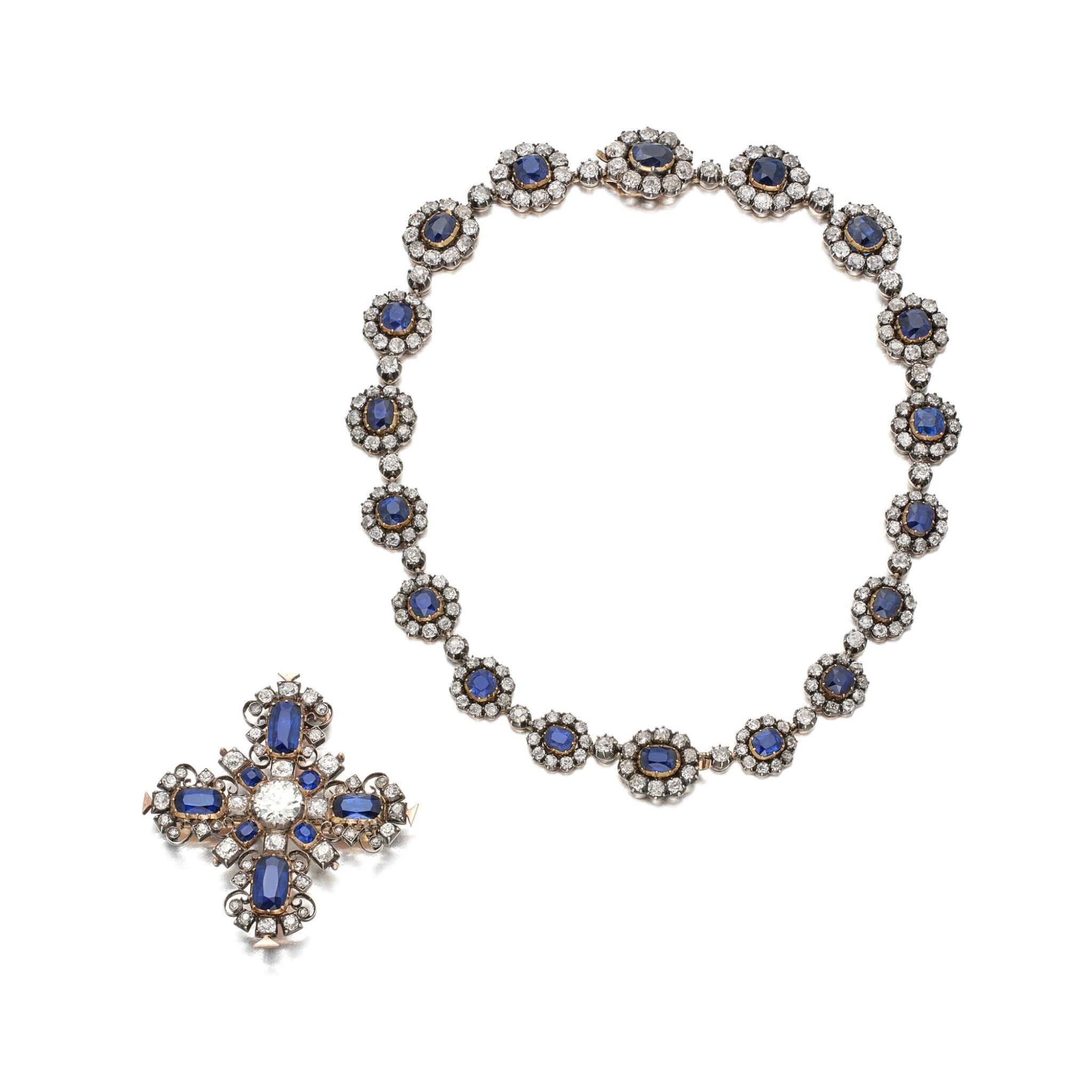 A Silver-Topped Gold, Sapphire and Diamond Necklace-Bracelet Combination and Pendant-Brooch, featuring oval-shaped and cushion-cut sapphires, surrounded and spaced by old mine-cut diamonds, the pendant-brooch in the form of a Maltese cross, centering an old European-cut diamond and set with cushion-cut sapphires and several old mine-cut diamonds, the necklace circa 1860s with later clasps, the pendant-brooch circa 1830s with a later pin mechanism. With a signed fitted box from Widowson & Veale, London.